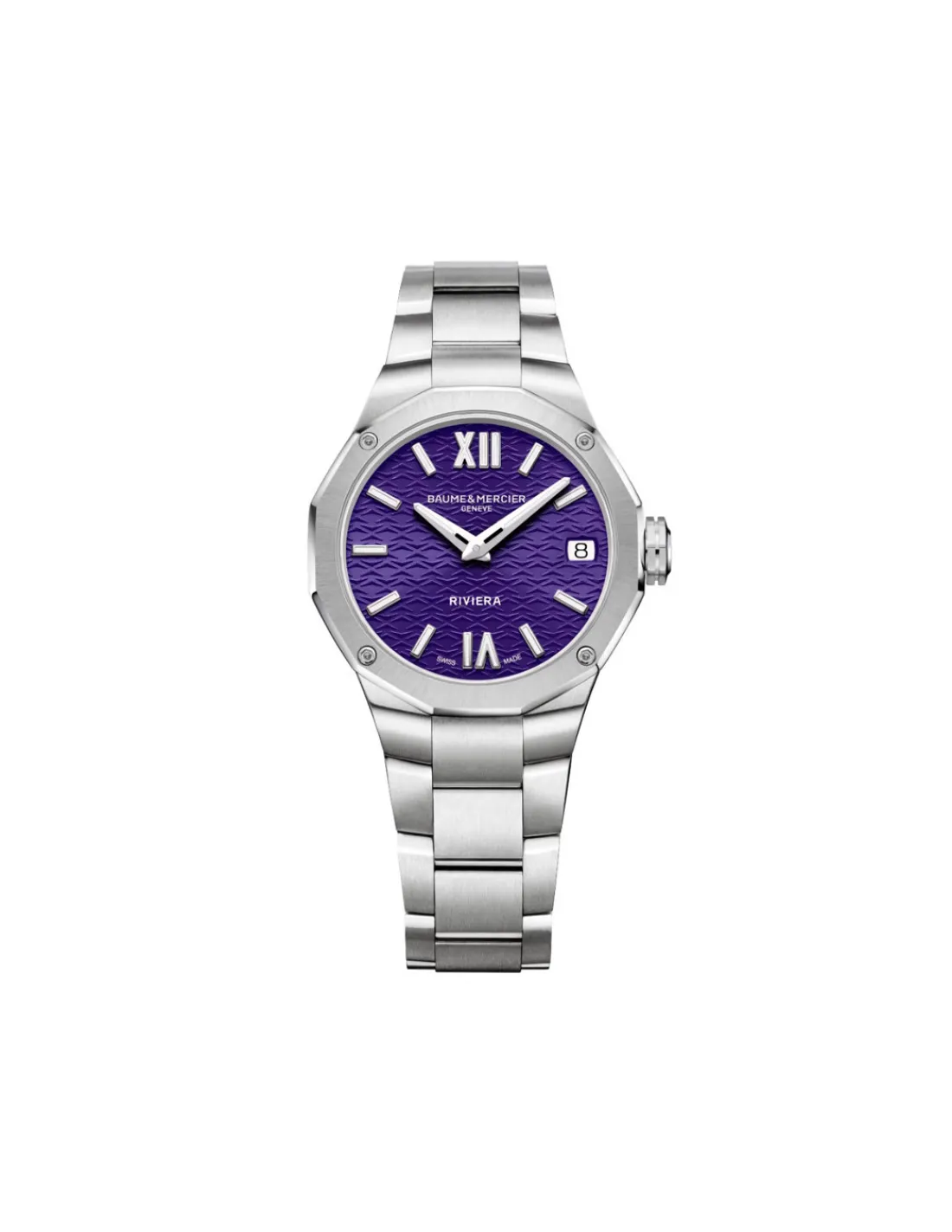 Reloj Baume et Mercier Riviera con caja de acero de 33 mm, esfera violeta con satinado soleil, números romanos, índices ribeteados con Superluminova y agujas facetadas rodiadas combinado con brazalete de acero. Un reloj con un diseño original idóneo para fuertes personalidades. Movimiento de cuarzo Swiss Made.