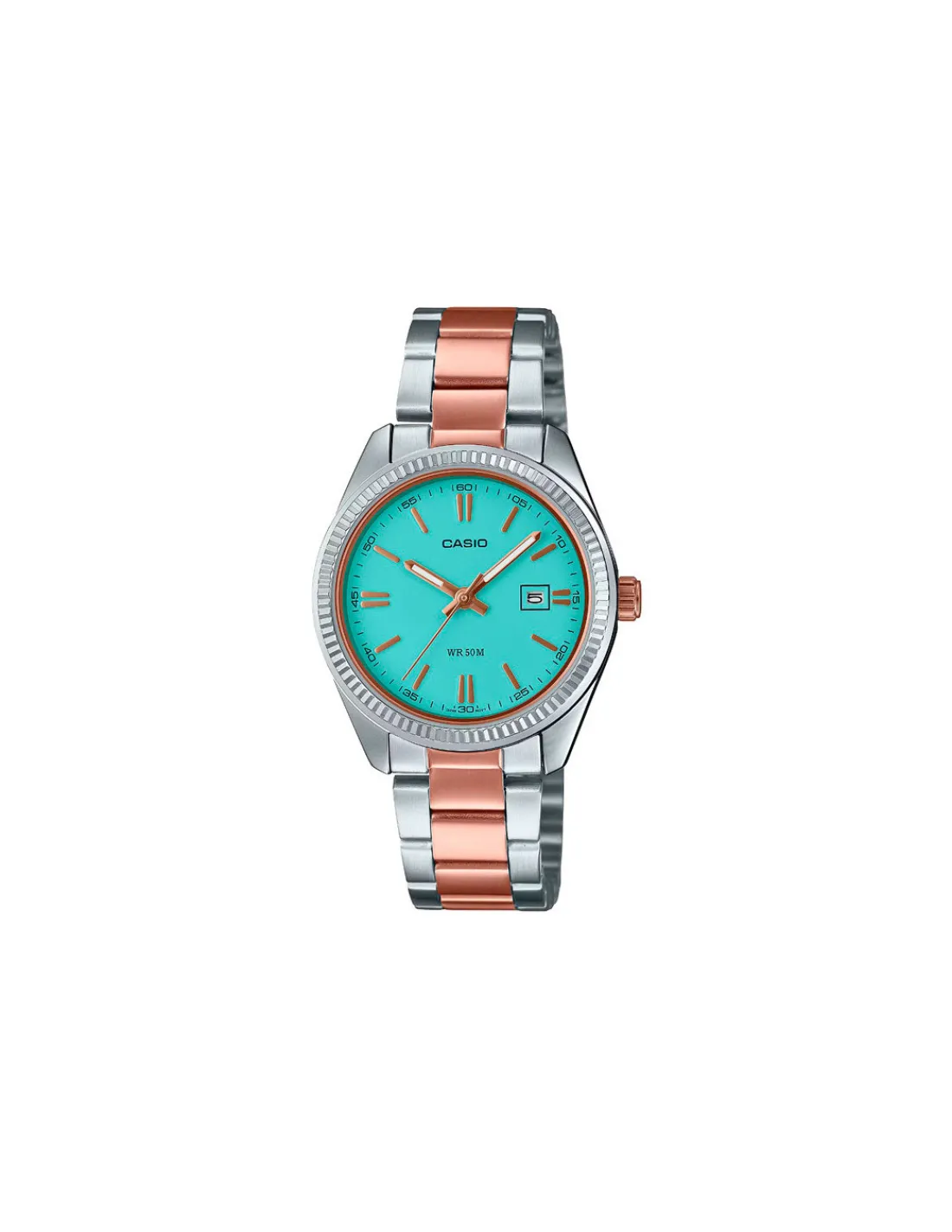 Reloj Casio Timeless LTP-1302PRG-2AVEF para mujer con caja de acero inoxidable, esfera turquesa y brazalete bicolor. Movimiento de cuarzo japonés.