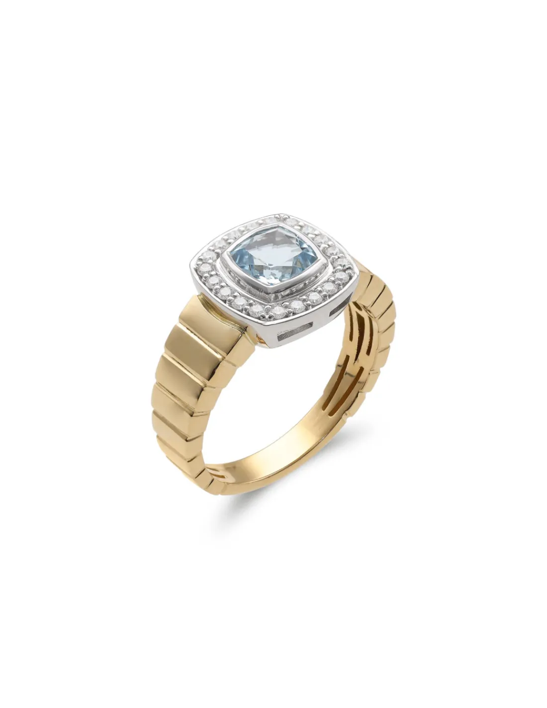 Anillo con aro de oro amarillo 1ª Ley (750 mmas) combinado con frente de oro blanco engastado con aguamarina talla cushion rodeada de diamantes talla brillante. Talla 12.