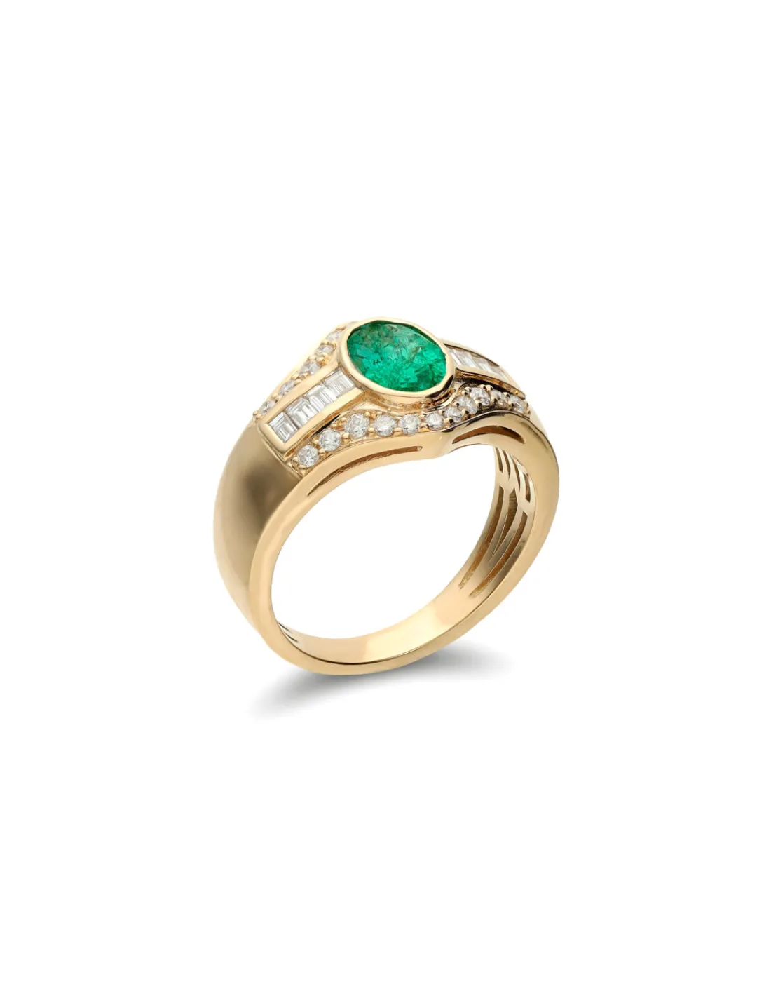 Anillo de oro amarillo 1ª Ley (750 mmas) con esmeralda natural talla oval combinada con diamantes talla brillante y talla baguette.