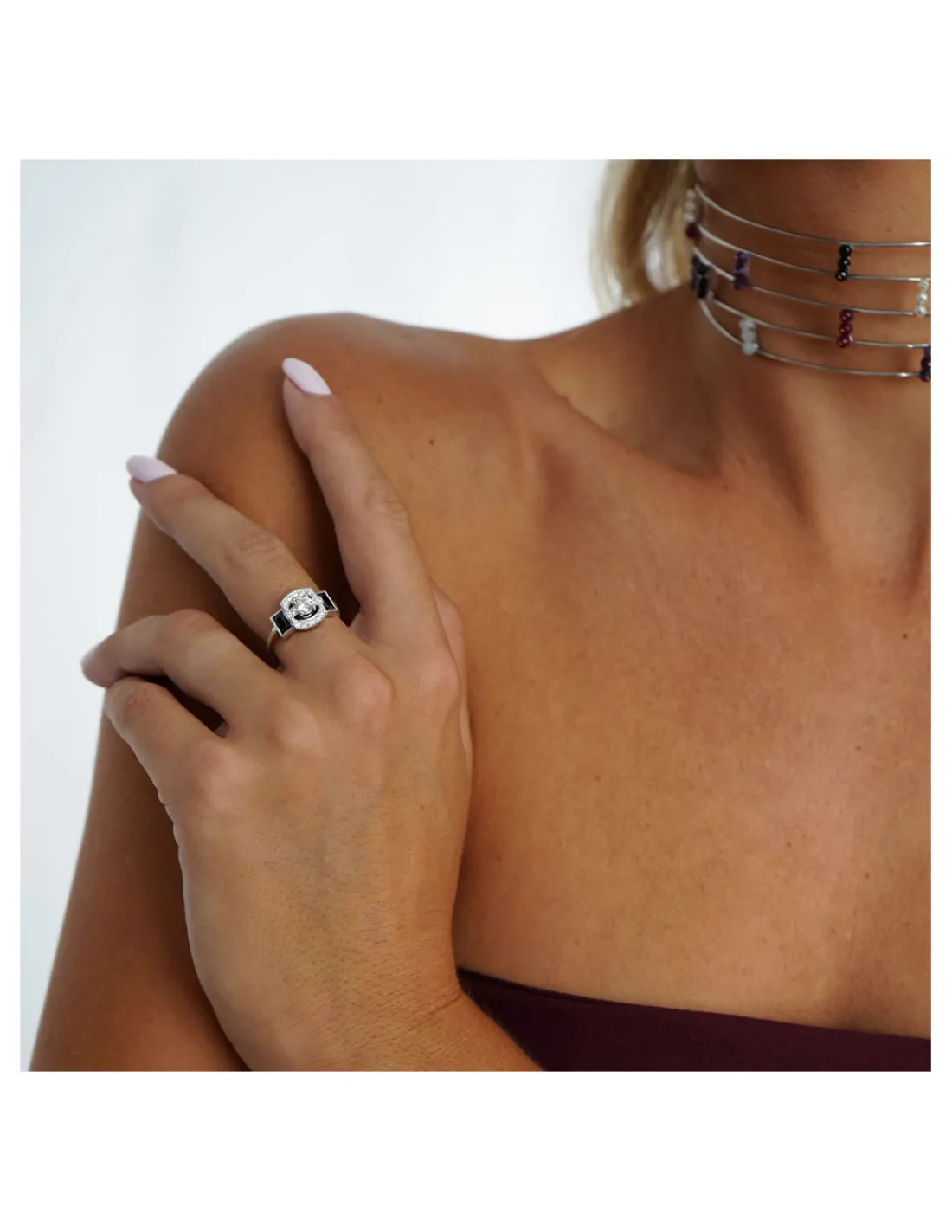 Anillo de oro blanco 1ª Ley (750 mmas) con orla de diamantes y ónix talla baguette. Una joya que captura el espíritu de Eclipsia: el equilibrio entre el misterio de la oscuridad y la intensidad de la luz.