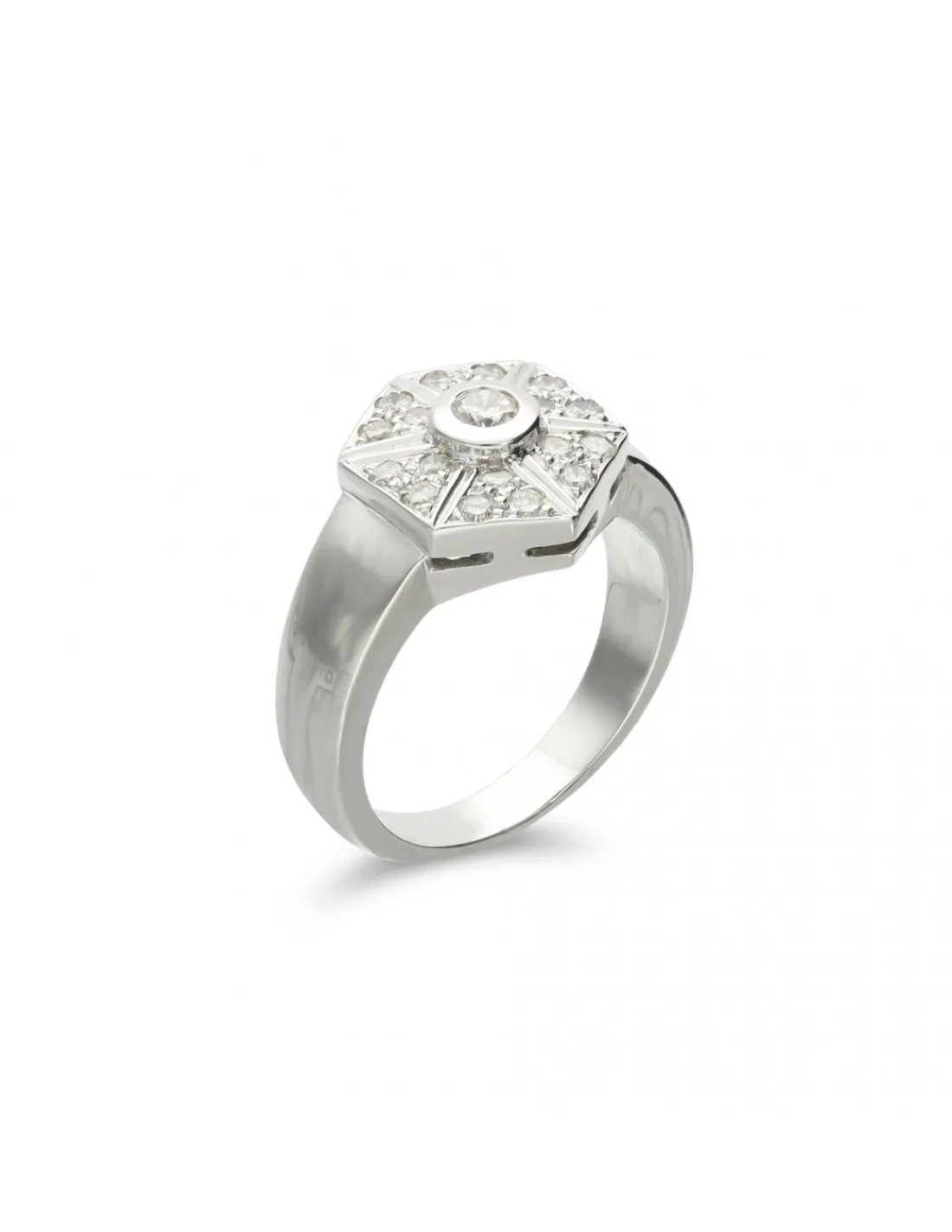 Anillo de oro blanco 1ª Ley (750 mmas) con centro de diamantes engastado en forma hexagonal.