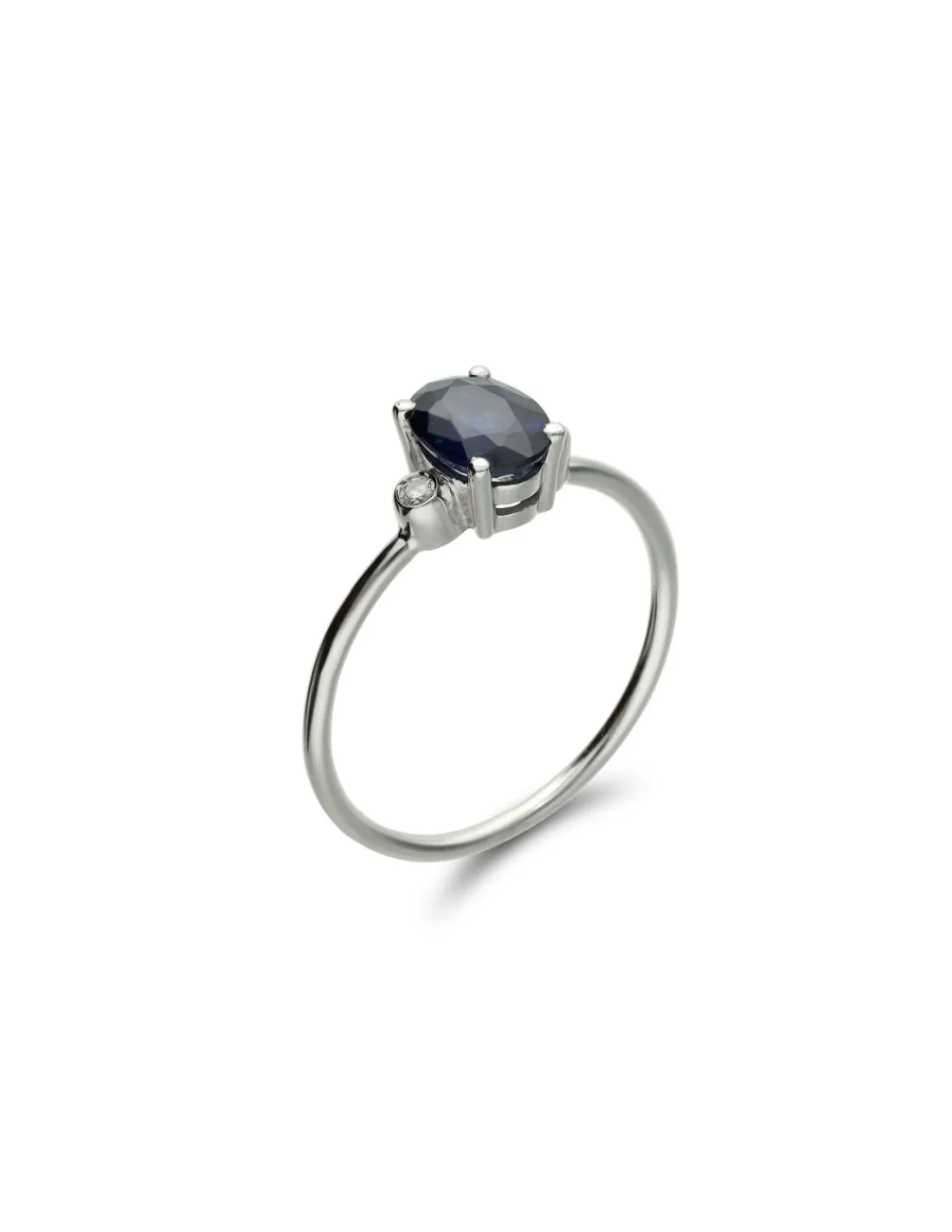 Anillo de oro blanco 1ª Ley (750 mmas) con zafiro talla oval en el centro y dos diamantes talla brillante a los laterales. Una joya sencilla y elegante para usar a diario o en momentos más especiales.
