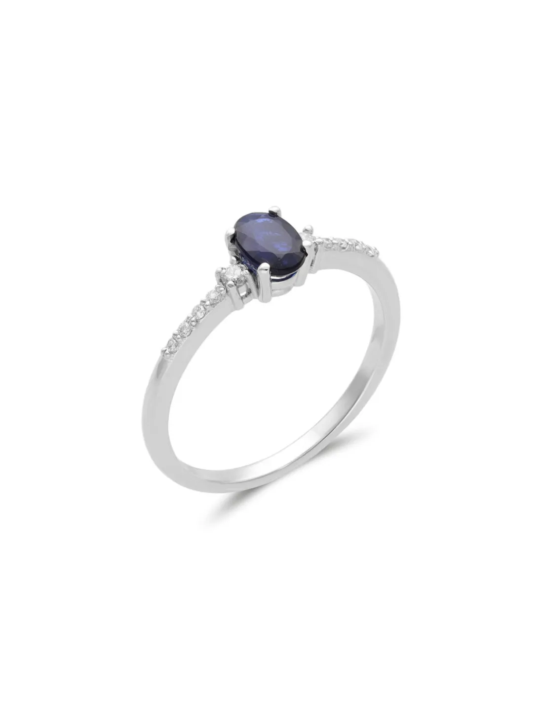 Anillo de oro blanco 1ª Ley (750 mmas) con zafiro natural oval y diamantes talla brillante. Una pieza ideal para pedida de mano con un diseño sencillo y moderno.