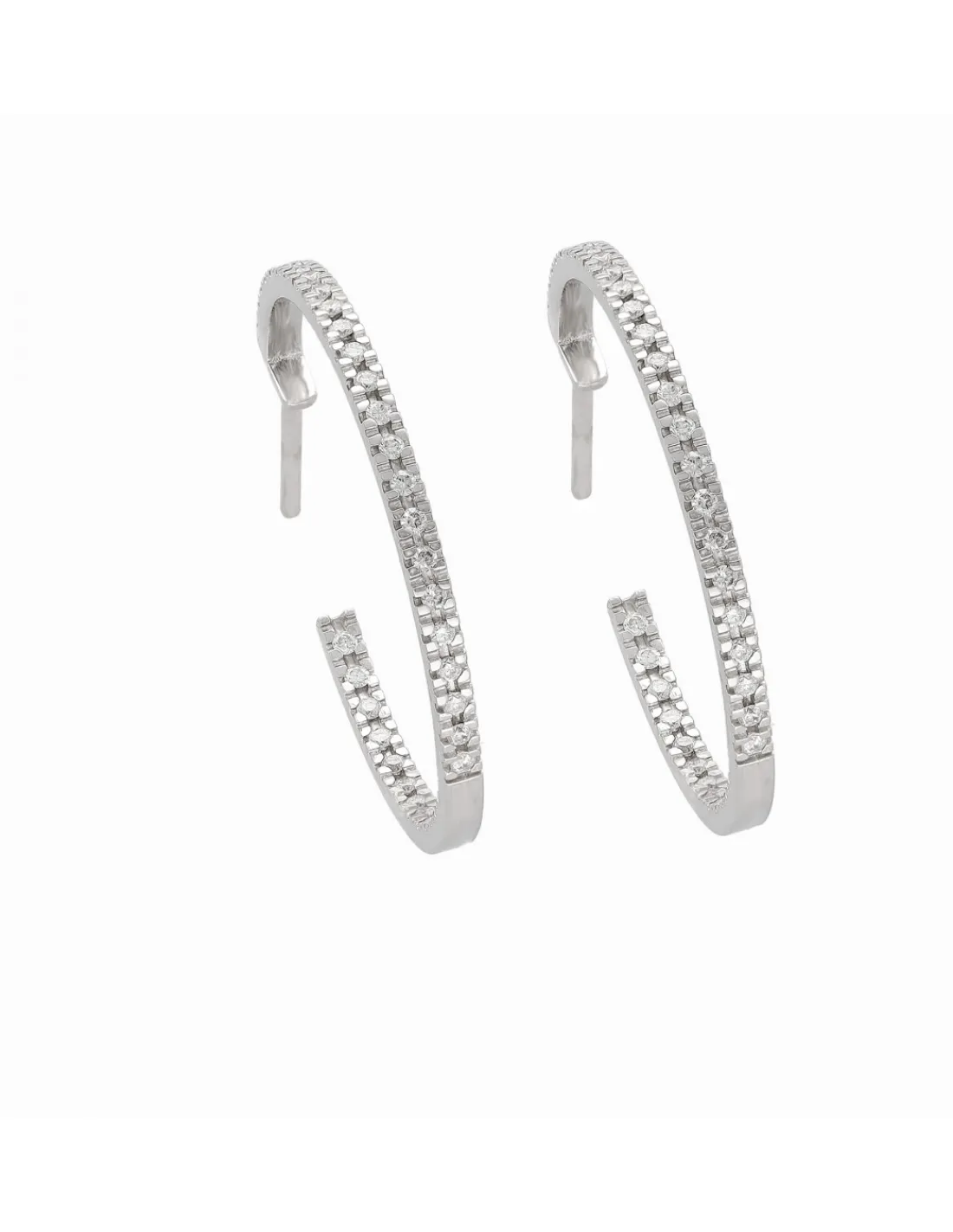 Argollas de oro blanco 1º Ley ( 750 mmas ) redondas con diamantes redondos naturales engastados en garritas. Una joya elegante y chic para vestir tus looks más especiales.