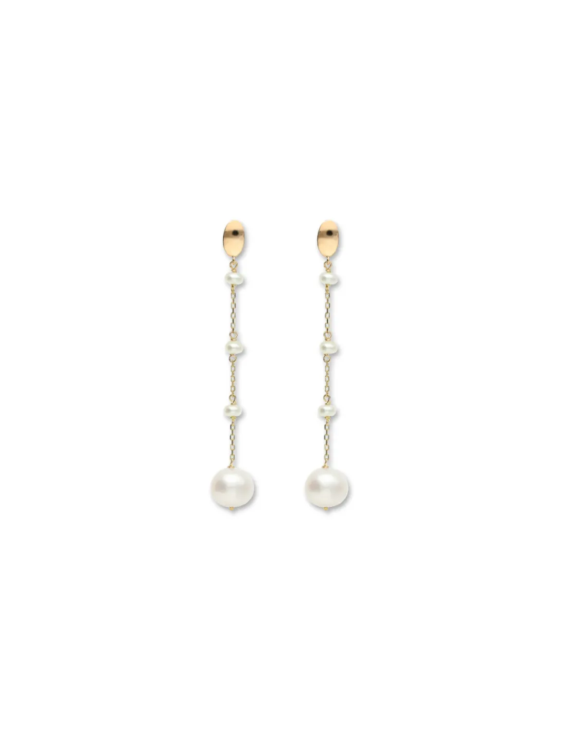 Pendientes de oro amarillo 1ª Ley (750 mmas) con dije ovalado del que cuelga una cadena con varias perlas. Un pendiente elegante y minimalista para cualquier ocasión.