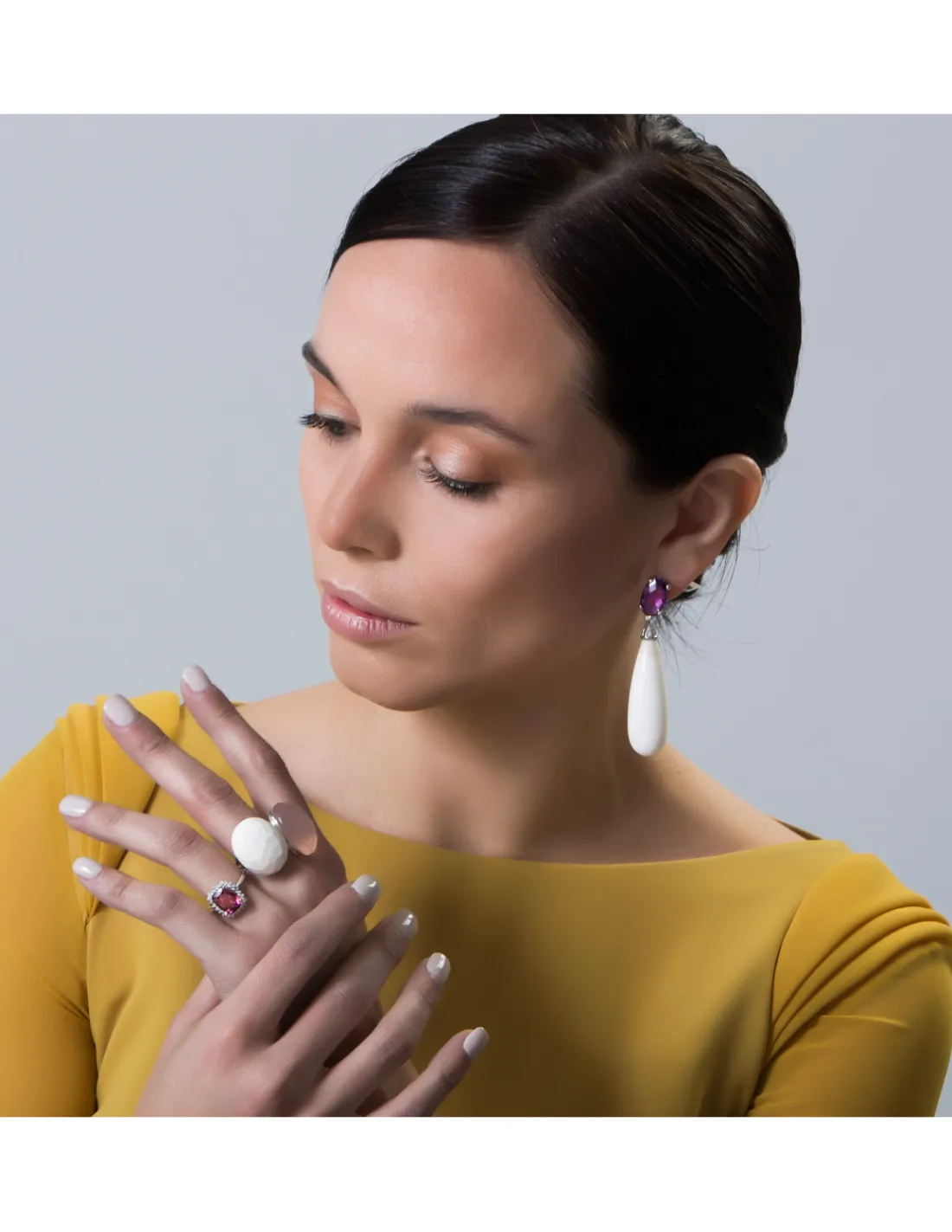 Pendientes de oro blanco 1ª Ley (750 mmas) que combina amatista oval con diamantes de la que cuelga una lágrima de coral blanco. Un pendiente moderno y llamativo por la combinación de colores. Cierra de palillo y presión. Largo aproximado 7 cm.