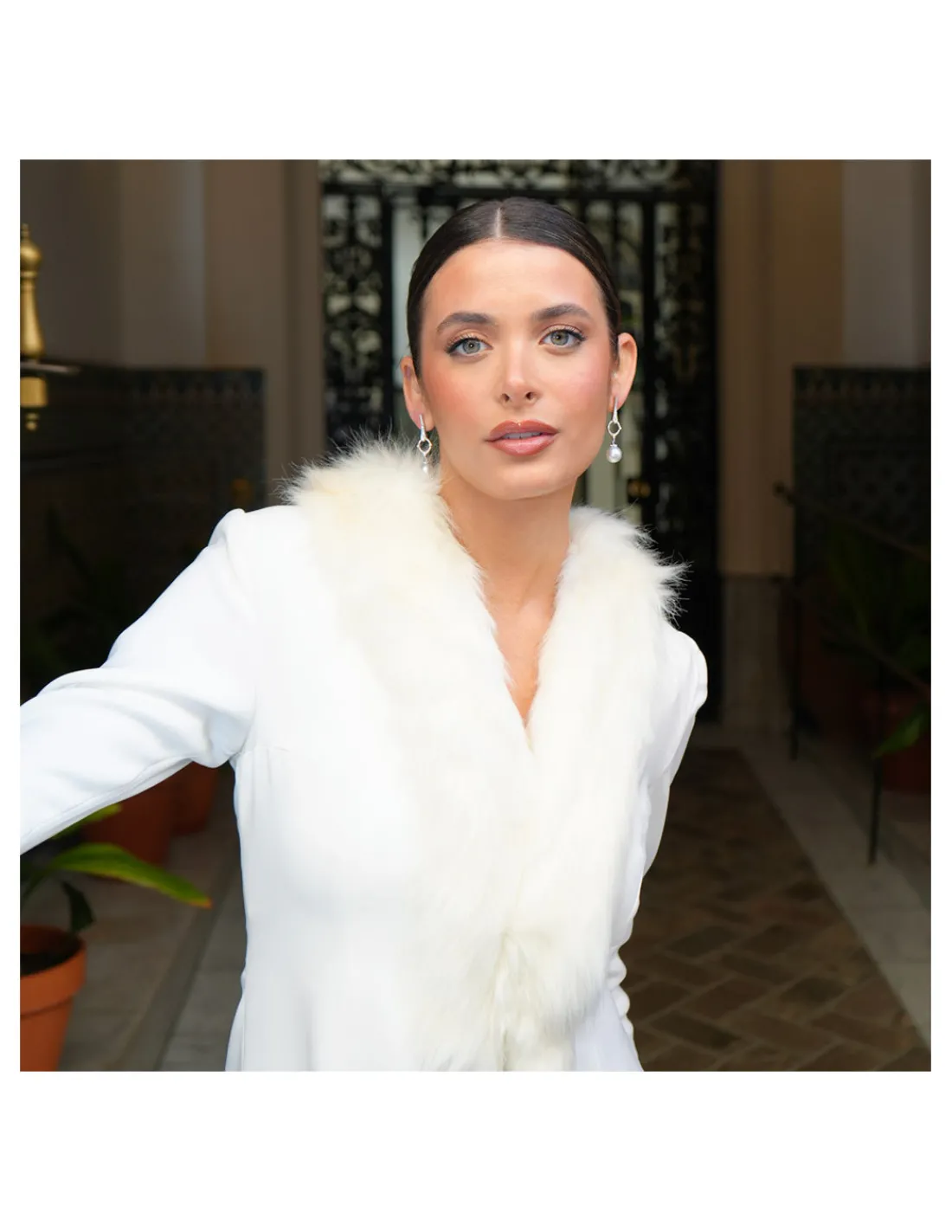 Pendientes de oro blanco 1ª Ley (750 mmas) que combina un diseño art deco con diamantes talla brillante y perla australiana. Una joya inspirada en el clasicismo atemporal para novias.