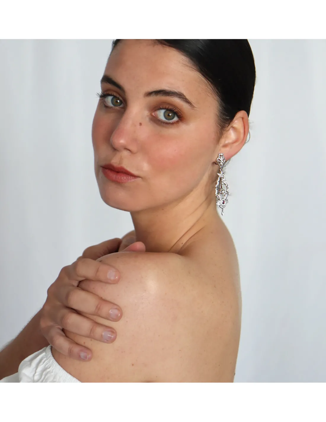 Pendientes de oro blanco 1ª Ley (750 mmas) estilo vintage con rubí y diamantes naturales. Una joya exclusiva con un diseño antiguo.