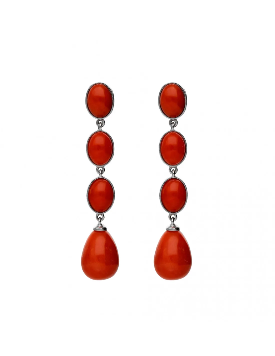 Pendientes de oro blanco 1ª Ley (750 mmas) con barra de corales talla oval con movimiento. Una joya elegante con intensidad de color. Largo aproximado 4,5 cm. Cierre de palillo y presión.