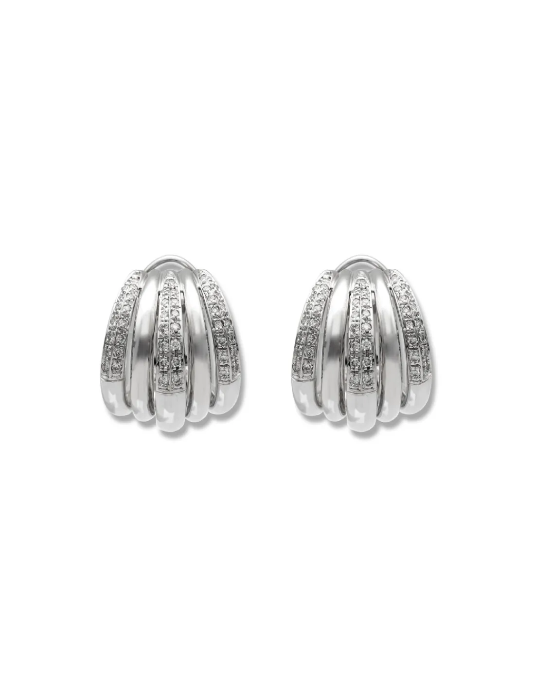 Pendientes de oro blanco 1ª Ley (750 mmas) con cinco argollas unidas combinados con diamantes talla brillante. Una joya robusta llena de estilo diseñada para no pasar desapercibida.