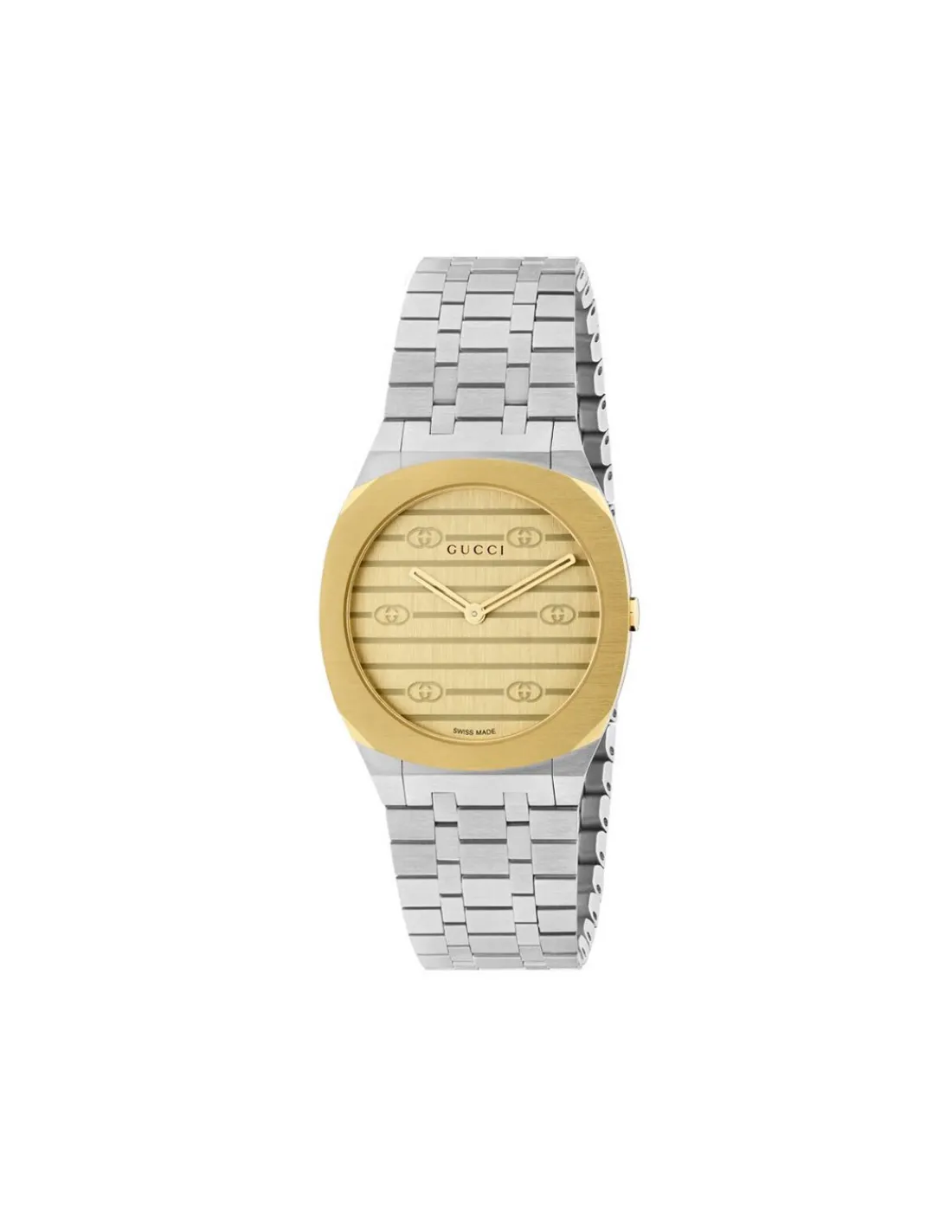 Reloj Gucci 25H para mujer con caja de acero de 30 mm, esfera dorada con motivo de GG y brazalete de acero. Una pieza inspirada en las elegantes formas de la arquitectura contemporánea que representa la elegancia propia de Gucci. Movimiento de cuarzo Swiss Made.