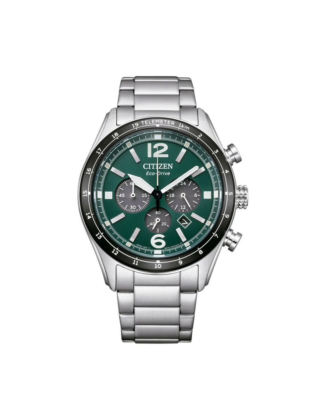 Reloj Citizen Chrono Aviation con caja de acero inoxidable de 43 mm de diámetro, esfera verde con agujas y marcas con luminous, bisel black fijo con taquímetro, cristal mineral y brazalete de acero. Movimiento Eco Drive B620 con reserva de carga 9 meses.