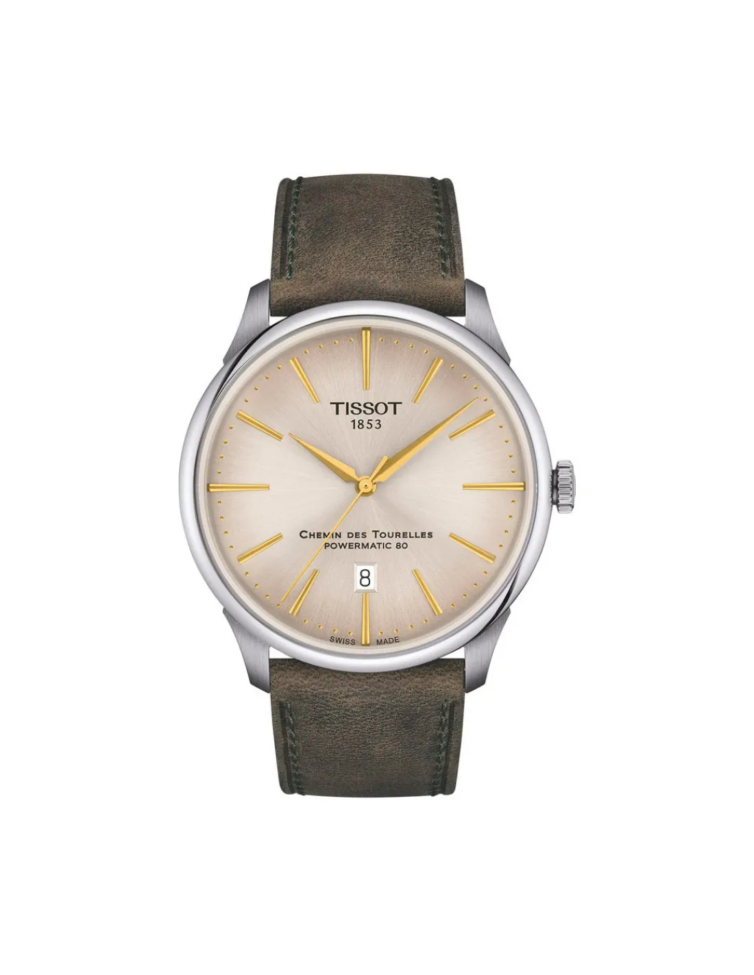 Reloj Tissot Chemin Des Tourelles Powermatic 80 T139.407.16.261.00 para hombre con caja de acero, esfera marfil con índices y agujas doradas y correa de piel de vacuno. Un reloj clásico pero a la vez moderno y refinado con movimiento automático Swiss made y 80 horas de reserva de marcha.