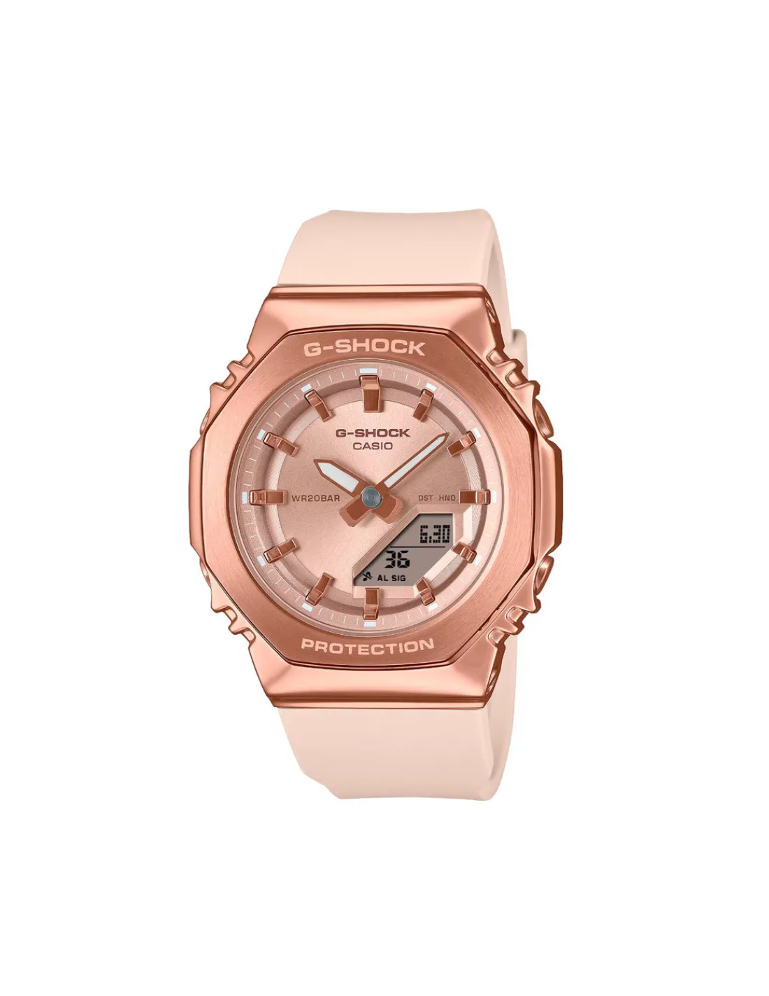 Reloj Casio G-Shock con carcasa de resina/acero inoxidable de 40,5 mm de diámetro, esfera analógica/digital, bisel chapado en iones de color oro rosa, cristal mineral y correa de resina. Movimiento de pila japonés. Robusto, elegante y con estilo: ahora con un revestimiento metálico en radiantes tonos de sofisticado color. Sumergible 200 metros. Un reloj resistente a los golpes con funciones como iluminación Led, hora mundial, temporizador, cronómetro, alarma, calendario, etc. Duración aproximada de la batería: 3 años en CR1025.
