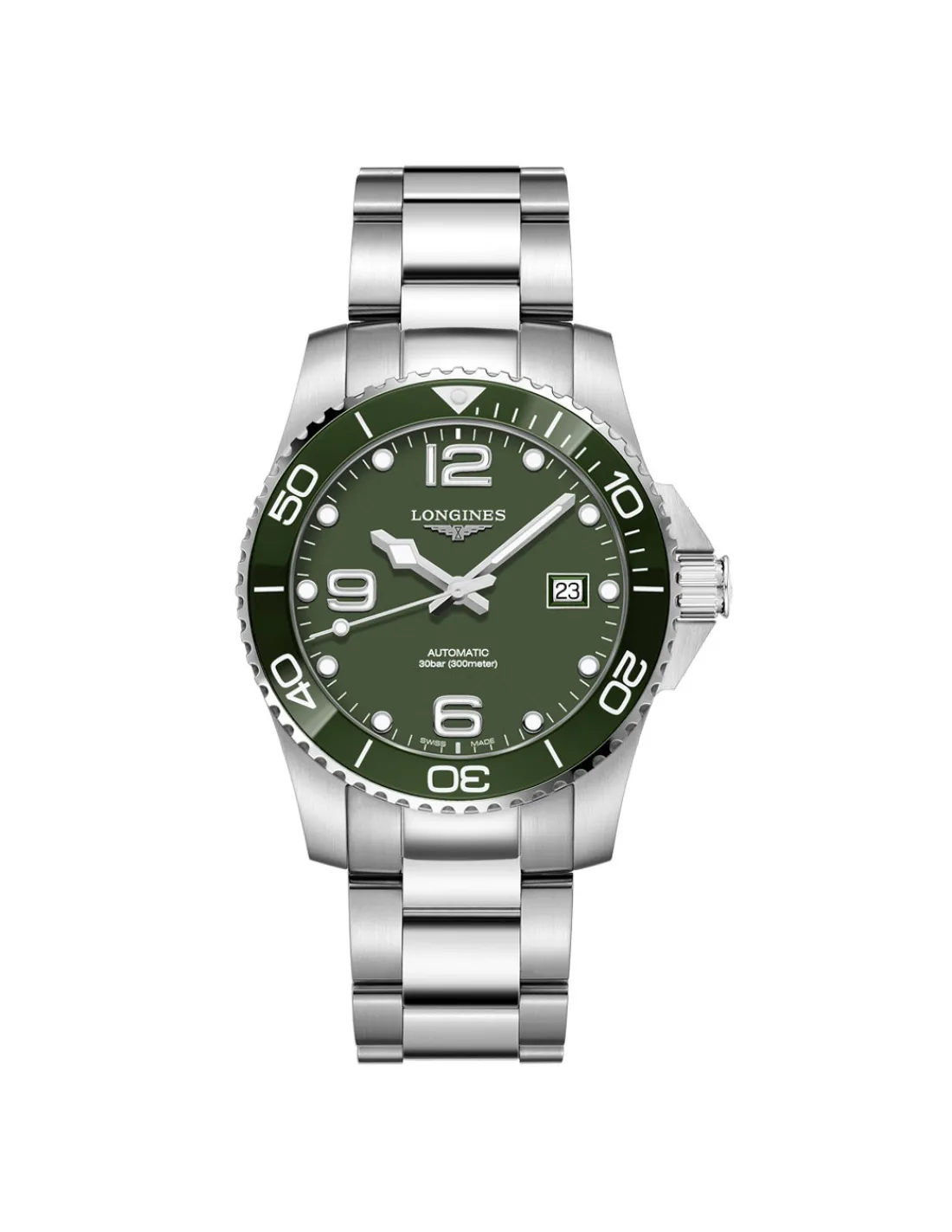 Reloj Longines Hydroconquest para hombre con caja de acero y cerámica de 41 mm de diámetro, esfera verde mate con números árabes y agujas plateadas luminiscentes acompañado de brazalete de acero. Un reloj que destaca por su elegancia y su alto rendimiento. Movimiento automático Swiss Made y 72 horas de reserva de marcha.