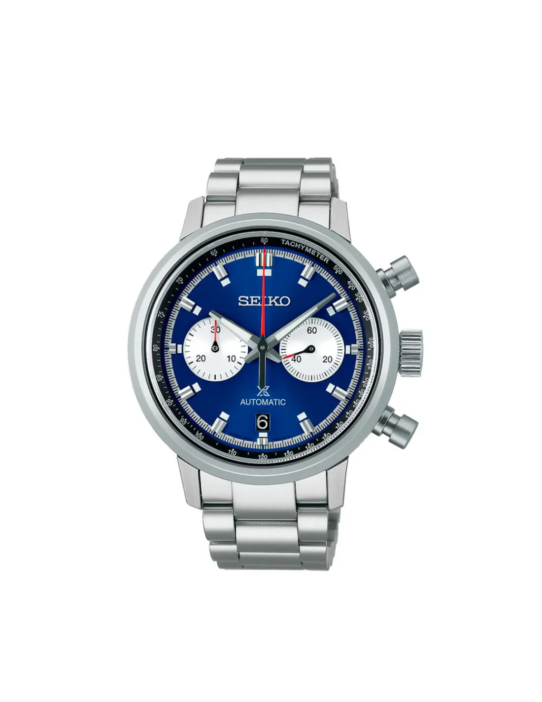 Reloj Seiko Prospex Speedtimer SRQ043J1 para hombre con caja de acero inoxidable, esfera color azul y brazalete. Movimiento automático con capacidad de carga manual.