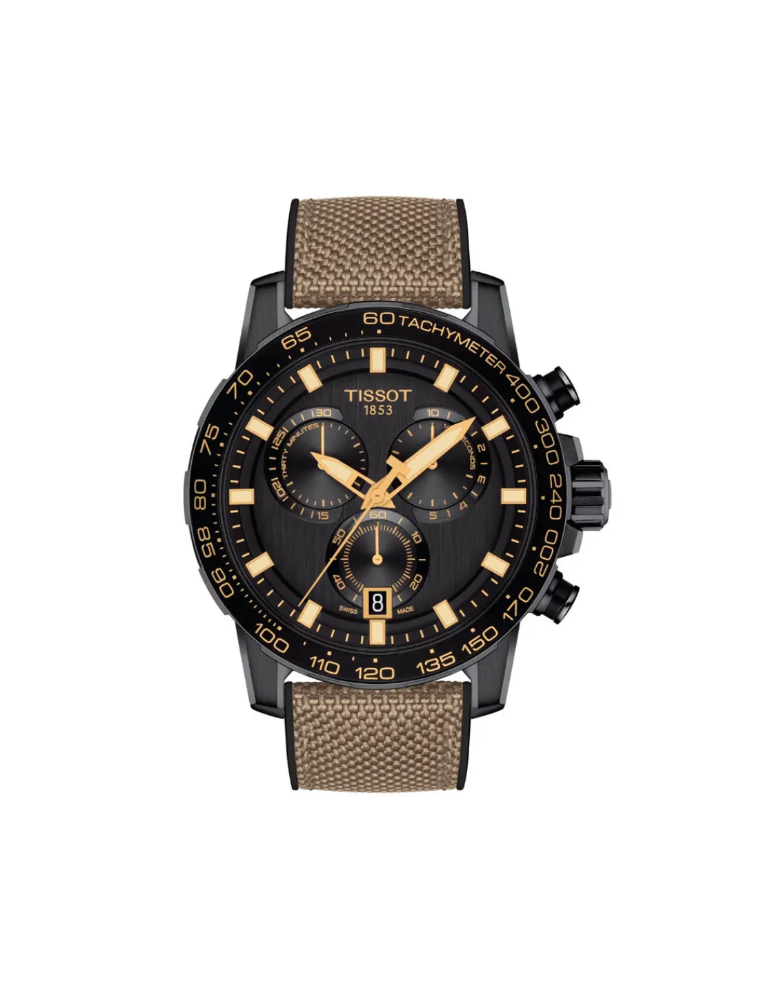Reloj Tissot SuperSport Chrono para hombre con caja de acero y revestimiento de PVD negro de 45.5 mm de diámetro, esfera negra con índices superluminova y correa de piel con relieve beige. Un reloj deportivo y a la vez moderno con movimiento cronógrafo de cuarzo Swiss Made.