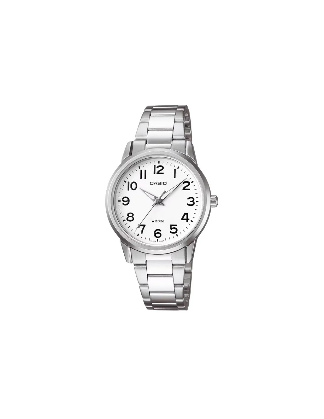 Reloj Casio Timeless con caja de acero inoxidable de 30 mm de diámetro con estuche y bisel ionizado, esfera blanca con números árabes y brazalete de acero. Movimiento de cuarzo japonés.