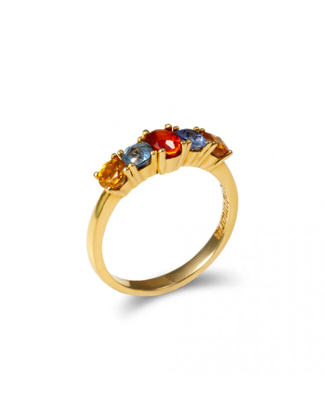 Anillo de oro amarillo 1ª Ley (750 mmas) con cinco zafiros de color. Una joya ideal que destaca por su toque de color. Talla 17.