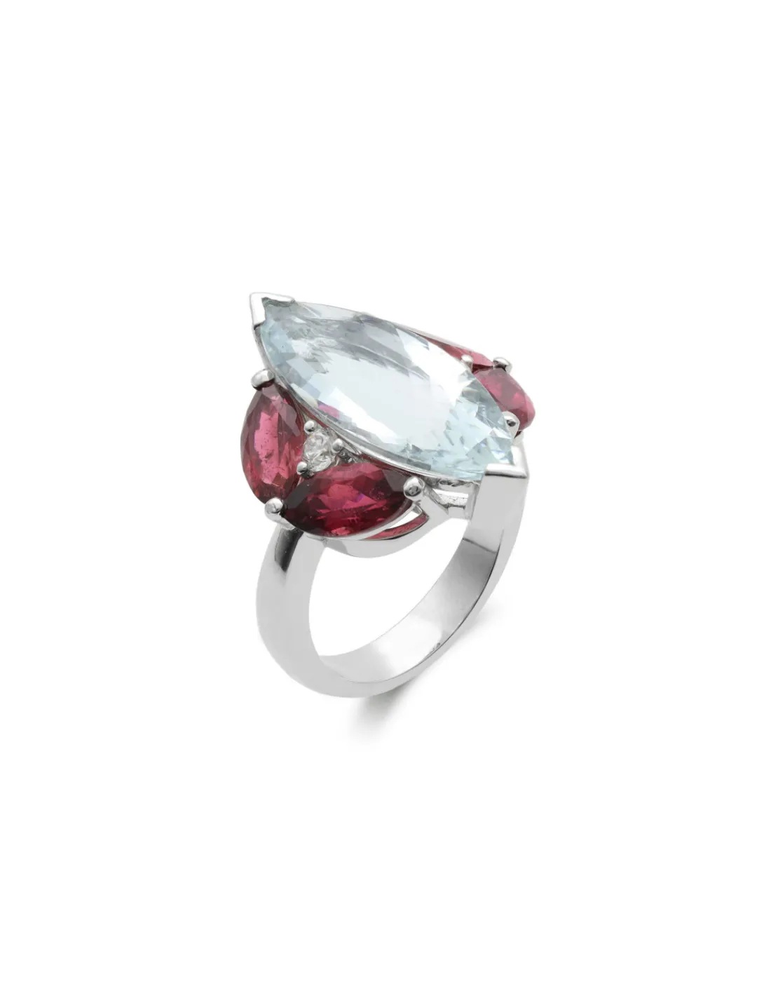 Anillo de oro blanco 1ª Ley (750 mmas) con una deslumbrante aguamarina talla marquise en el centro acompañada de turmalinas y diamantes.