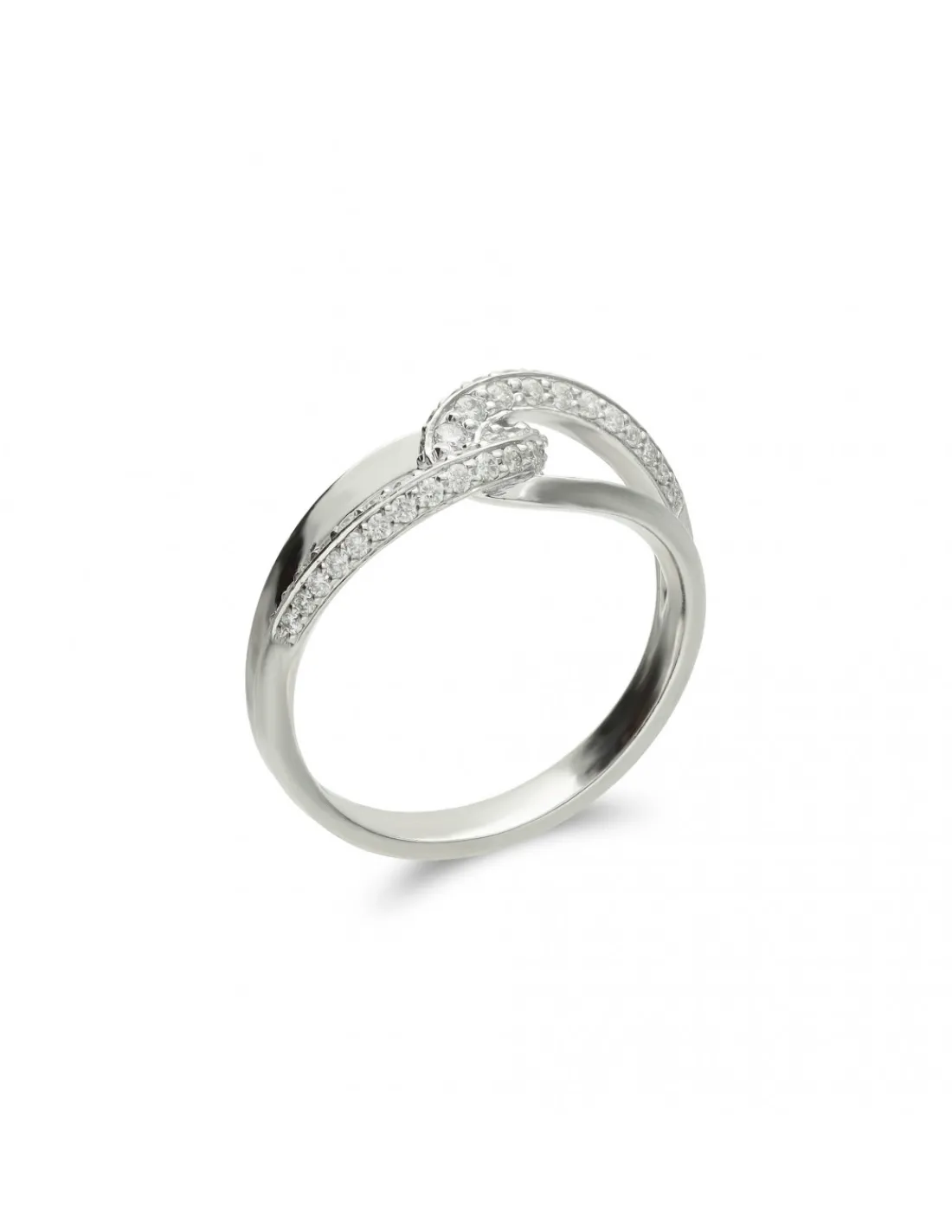Anillo de oro blanco 1ª Ley (750 mmas) entrelazado con diamantes talla brillante.