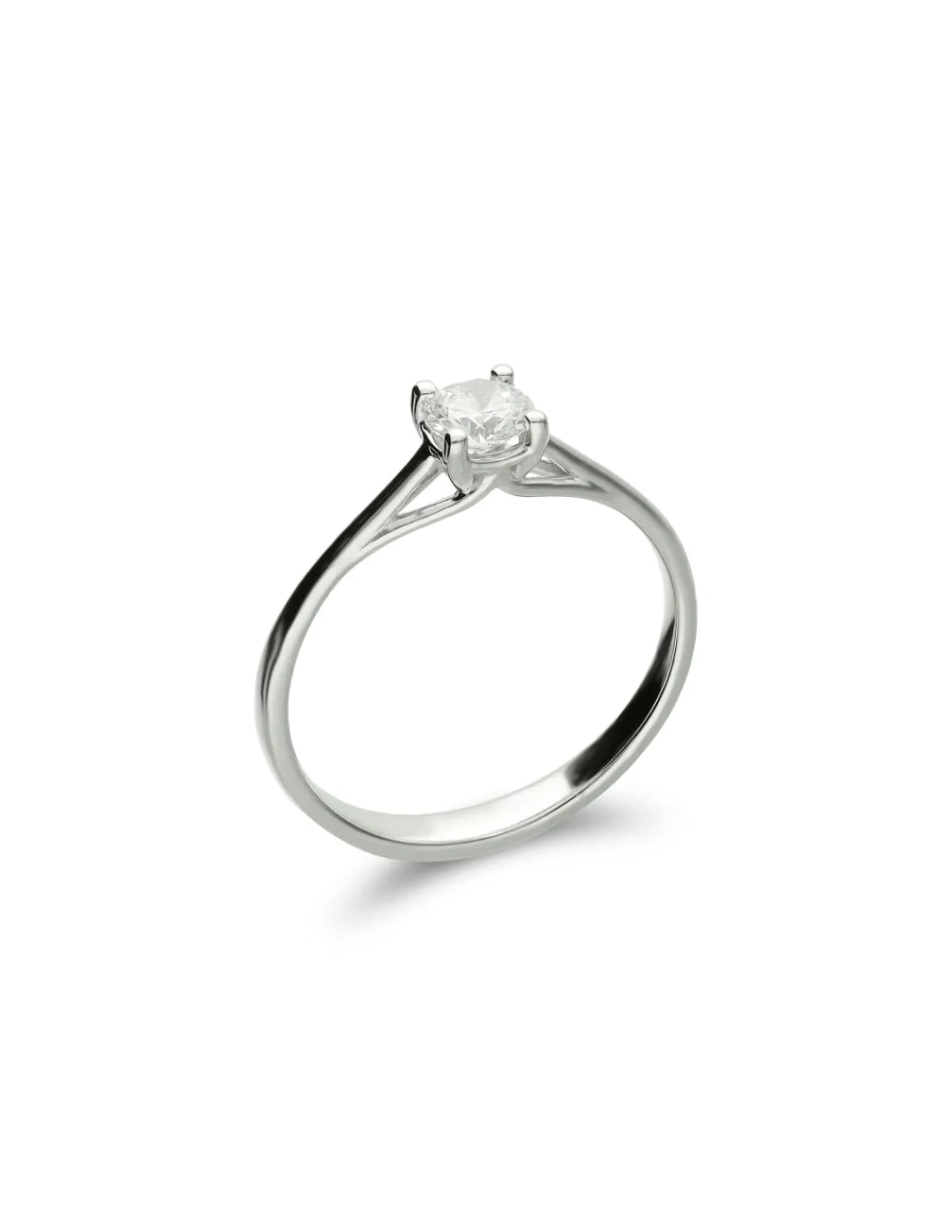 Anillo-Solitario de oro blanco 1ª Ley (750 mmas) con diamante talla brillante. Un diamante delicado y fino engarzado en cuatro garras es el detalle que aporta a esta joya su toque característico de exclusividad y elegancia.