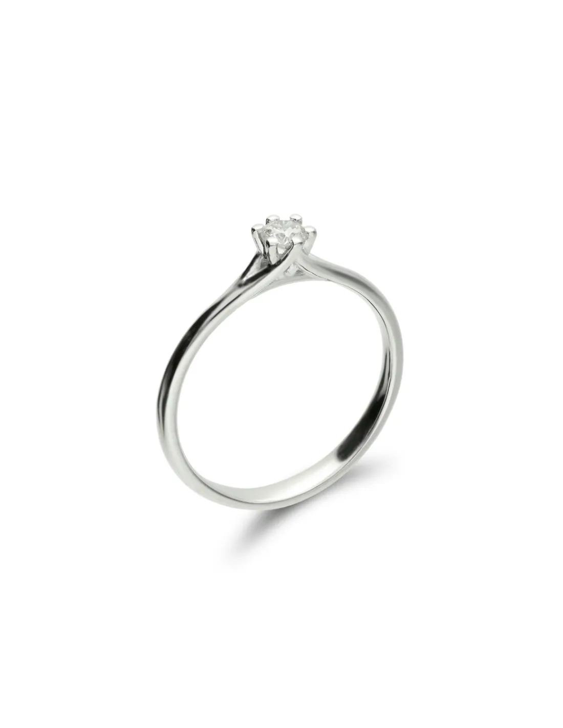 Anillo-Solitario de oro blanco 1ª ley (750 mmas) con diamante talla brillante engastado en seis garras. Una pieza sencilla que puedes combinar con otras joyas. Talla 12.