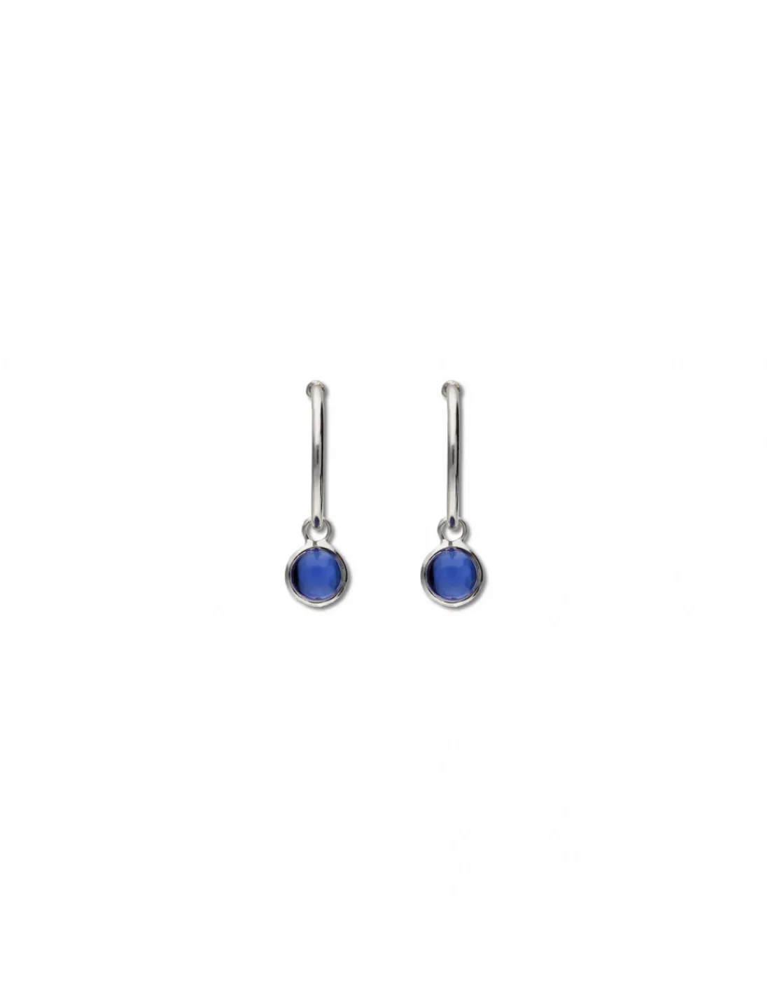 Pendientes de plata 1ª Ley (925 mmas) con forma de argolla de la que cuelga una piedra sintética azul talla cabujón engastada en boquilla. Un pendiente minimalista para el día a día.