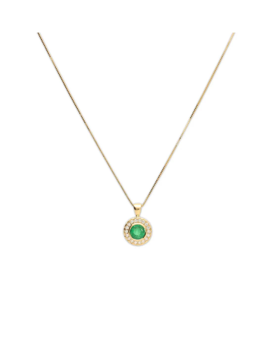 Cadena-Colgante de oro amarillo 1ª Ley (750 mmas) con esmeralda redonda como protagonista en el centro acompañada de diamantes talla brillante.