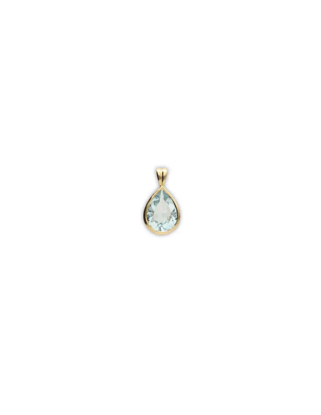 Colgante de oro amarillo 1ª Ley (750 mmas) con aguamarina talla pera engastada en boquilla. Tamaño aproximado incluyendo reasa 1,2 cm.
