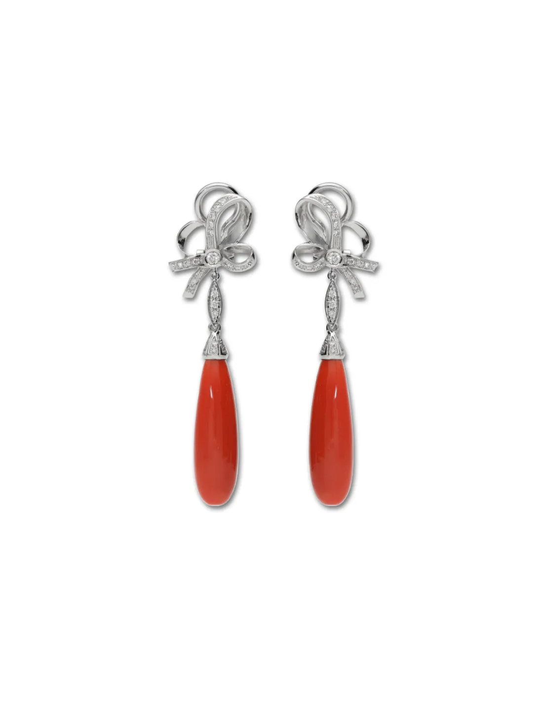 Pendientes de oro blanco 1ª Ley (750 mmas) que resalta por su diseño único en forma de lazo con diamantes engastados en grano del que cuelga una lágrima de coral con intenso color. Largo aproximado 5,8 cm. Cierre omega.