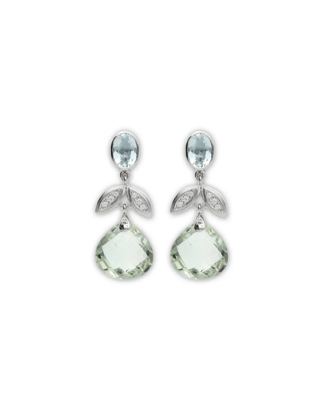Pendientes de plata 1ª Ley (925 mmas) con aguamarina oval engastada en boquilla combinada con circonitas y amatista verde talla pera briolette. Cierre de palillo y presión. Largo aproximado 3,5 cm.