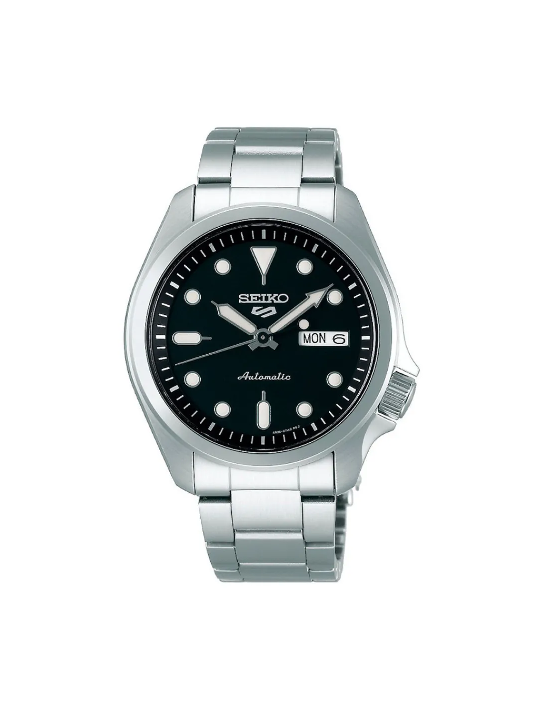 Reloj Seiko 5 Sports SRPE55K1 para hombre con caja y brazalete de acero y esfera negra. Movimiento automático.