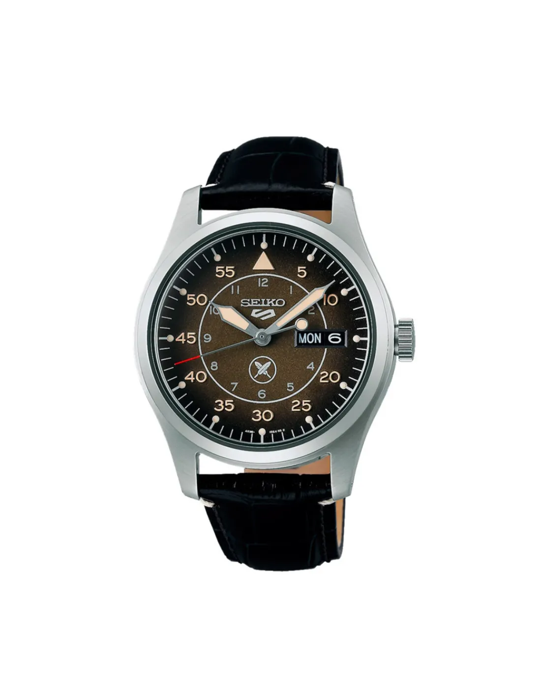 Reloj Seiko 5 Sports Yuto Horigome edición limitada para hombre con caja de acero inoxidable de 39,4 mm de diámetro, esfera degradada con patrón en relieve y con logotipo basado en el escudo familiar de Horigome a las seis en punto, Lumibrite en agujas e índices, cristal de Hardlex curvado y piel de becerro. Calibre 4R36. Movimiento automático con 41 horas de reserva de marcha aproximadamente.