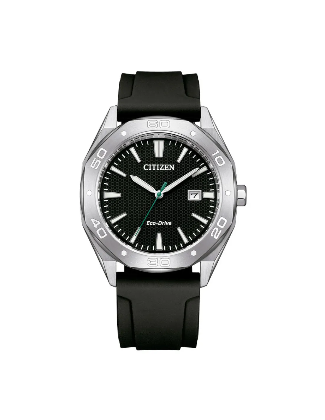 Reloj Citizen Active Sport con caja de acero inoxidable de 41 mm de diámetro, esfera negra, agujas y marcas con luminous, cristal mineral y correa de silicona negra. Movimiento Eco Drive E111 con reserva de carga 6 meses.