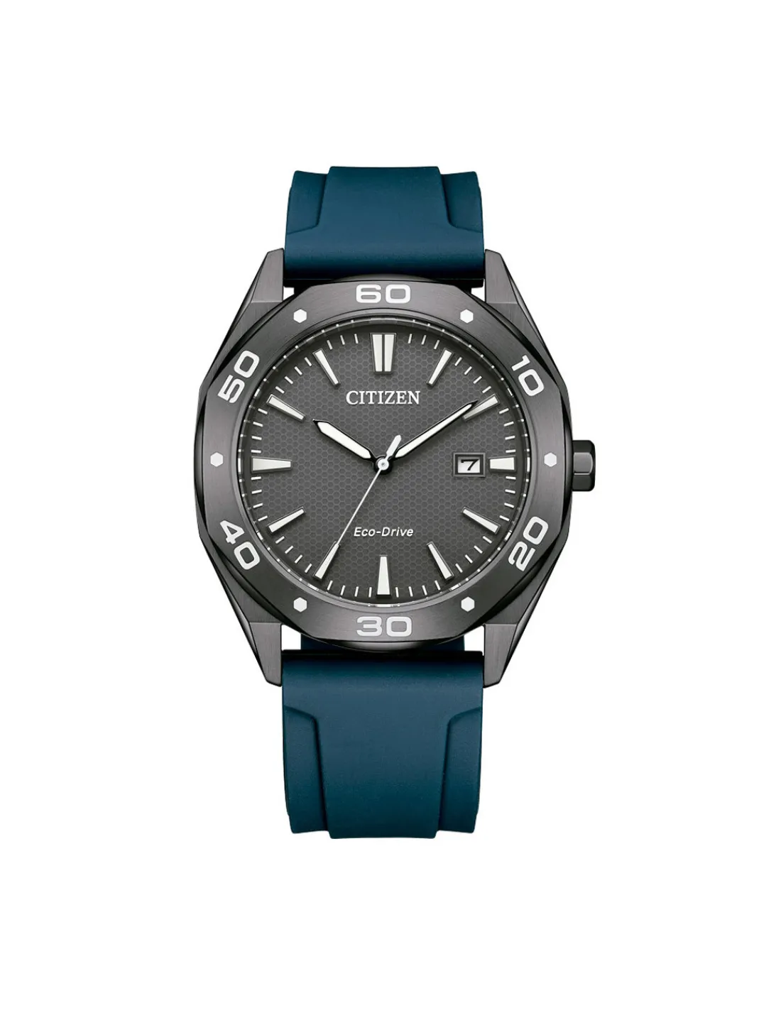 Reloj Citizen Active Sport con caja de acero inoxidable de 41 mm de diámetro, esfera gris, agujas y marcas con luminous, cristal mineral y correa de silicona azul. Movimiento Eco Drive E111 con reserva de carga 6 meses.