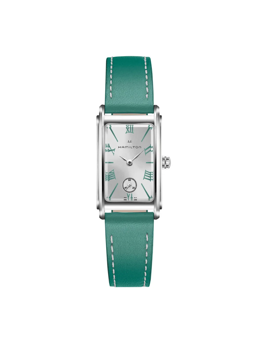 Reloj Hamilton American Classic Admore para mujer con caja de acero rectangular de 18,7 x 27 mm, esfera plateada con números romanos y correa de piel verde lisa. Movimiento de cuarzo Swiss Made.