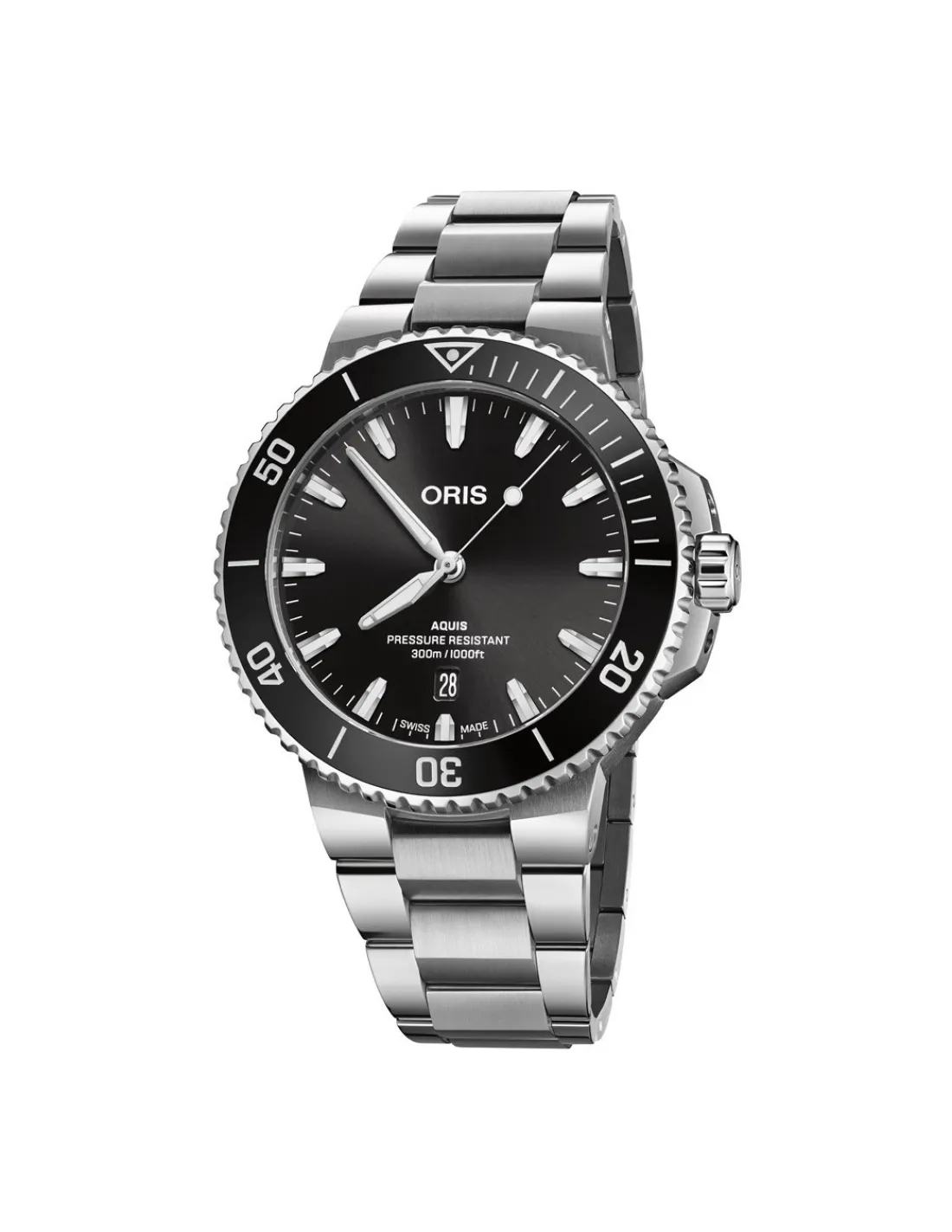 Reloj Oris Aquis Date unisex con caja de 43,5 mm de acero y bisel rotativo unidireccional con encarte cerámico, esfera negra con índices y agujas Superluminova y cristal de zafiro antirreflejos combinado con brazalete de acero. Movimiento automático Swiss Made y 38 horas de reserva de marcha. El Aquis Date es un reloj deportivo, fino y con un alto desempeño, un clásico moderno versátil, reforzado con una resistencia al agua de 300 metros.