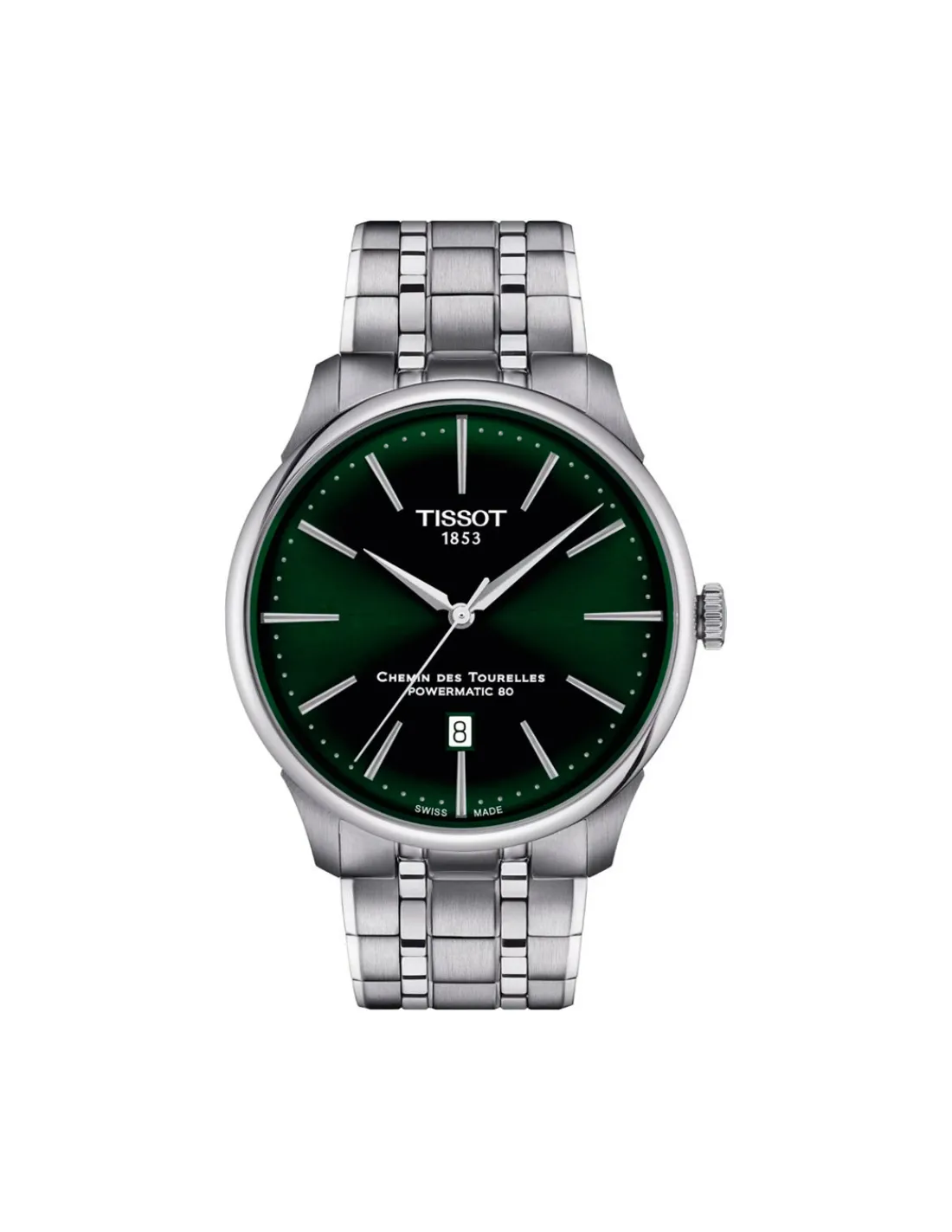 Reloj Tissot Chemin Des Tourelles Powermatic 80 T139.407.11.091.00 para hombre con caja de acero, esfera color verde y brazalete. Movimiento automático Swiss Made y 80 horas de reserva de marcha.