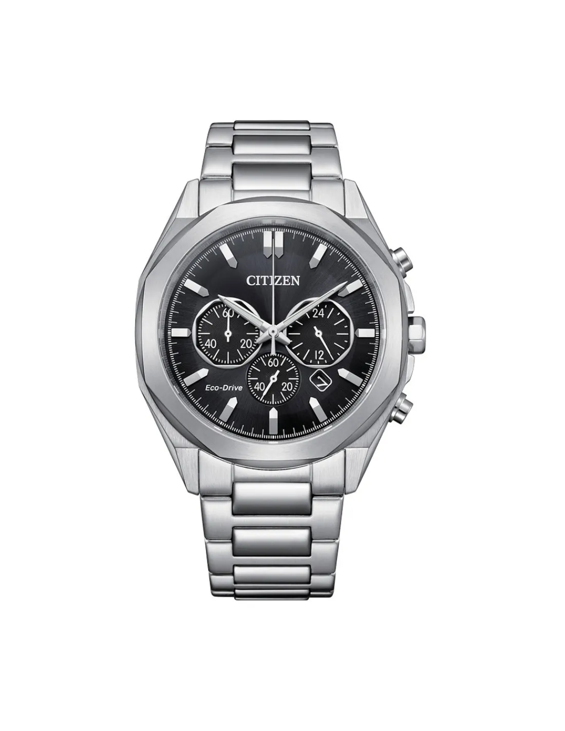 Reloj Citizen Chrono Elegant Eco Drive con caja de acero de 41 mm de diámetro, esfera negra con Lumen en agujas y marcas, cristal mineral y brazalete de acero con doble cierre. Cronógrafo 60 minutos a 1/5 de segundo. Movimiento Eco Drive B620 con reserva de carga 9 meses.