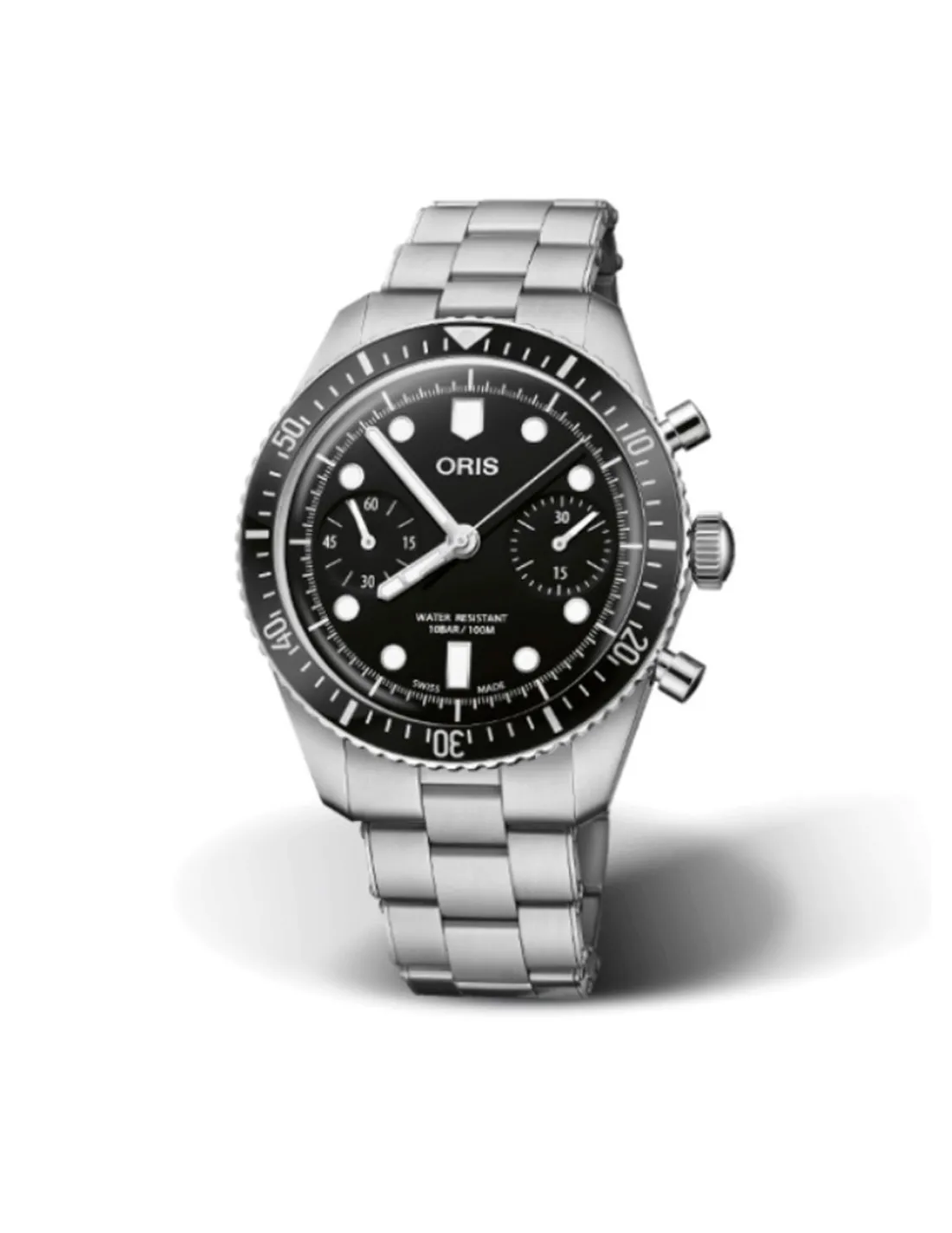 Reloj Oris Divers Sixty-Five Chronograph 01 771 7791 4054-07 8 20 18 para hombre con caja multipiezas de acero inoxidable, esfera negra y brazalete de acero. Movimiento automático Swiss Made con 48 horas de reserva de marcha aproximadamente.
