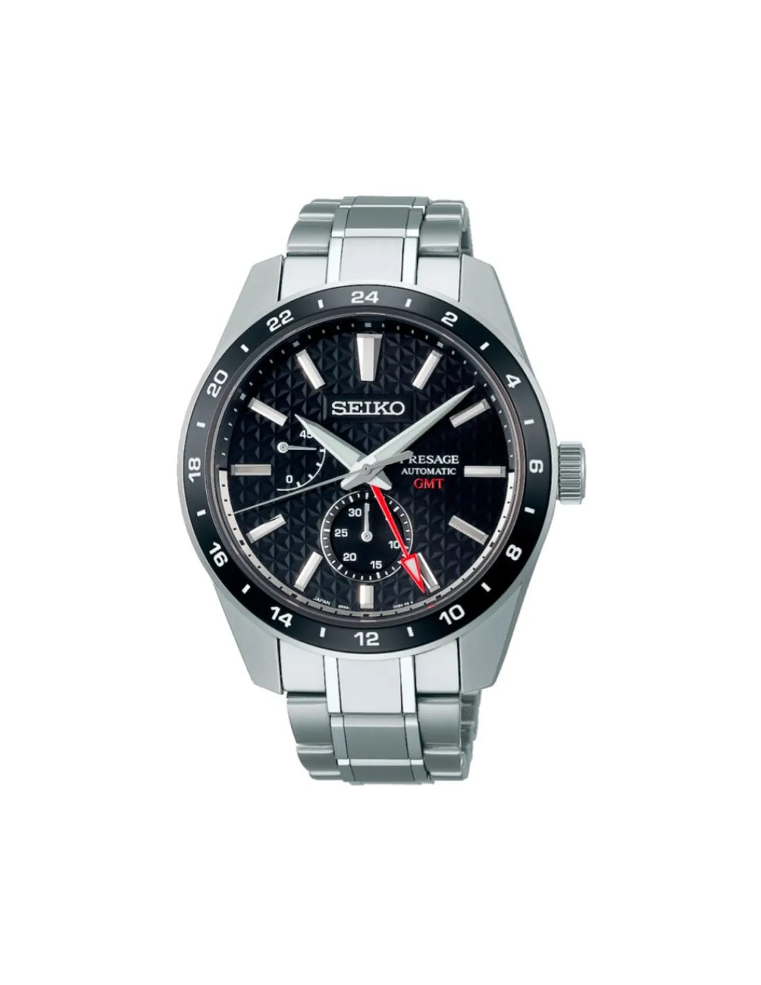 Reloj Seiko Presage Sharp Edged Series con caja de acero inoxidable de 42,2 mm, esfera negra con índices y agujas Lumibrite, cristal de zafiro, revestimiento antirreflectante en la superficie interna y brazalete de acero. Calibre 6R64. Función de indicación de doble horario GMT. Movimiento automático con capacidad de carga manual y una duración de 45 horas aproximadamente.