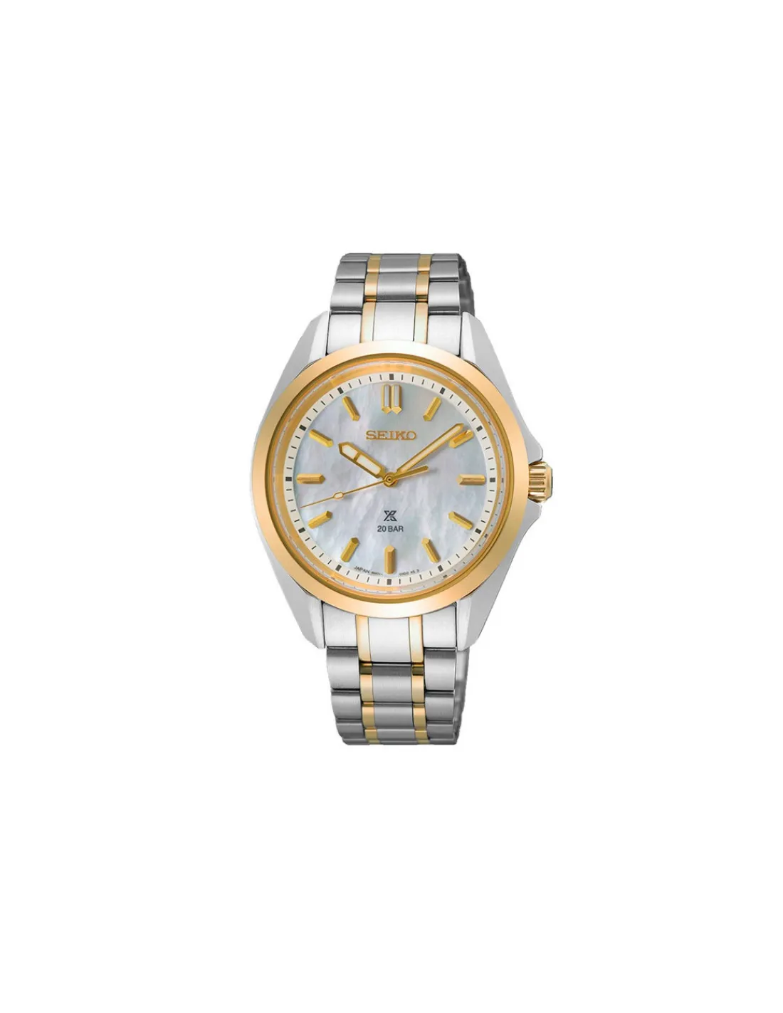 Reloj Seiko Prospex para mujer con caja de acero chapado oro de 34 mm de diámetro, esfera de nácar, índices y agujas Lumibrite, cristal de zafiro curvado y brazalete de acero bicolor. Calibre 6N01. Movimiento de cuarzo japonés.