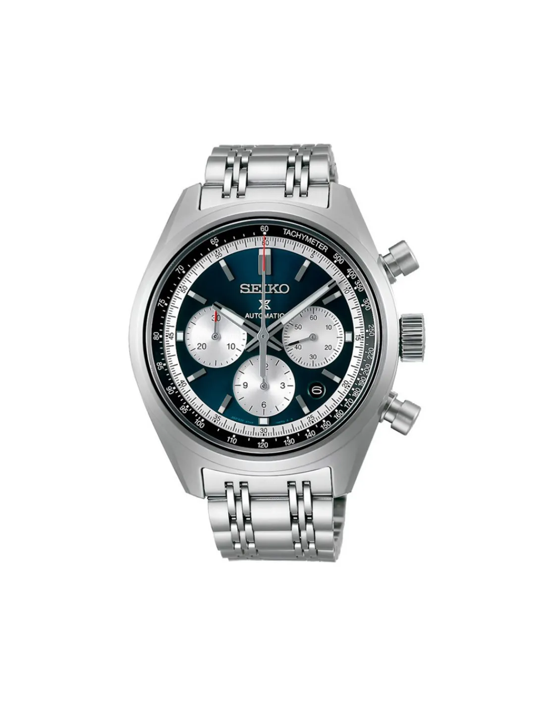 Reloj Seiko Prospex Speedtimer SRQ051J1 con caja de acero inoxidable, esfera azul y brazalete. Cronógrafo hasta 30 minutos y 12 horas. Movimiento automático con capacidad de carga manual.