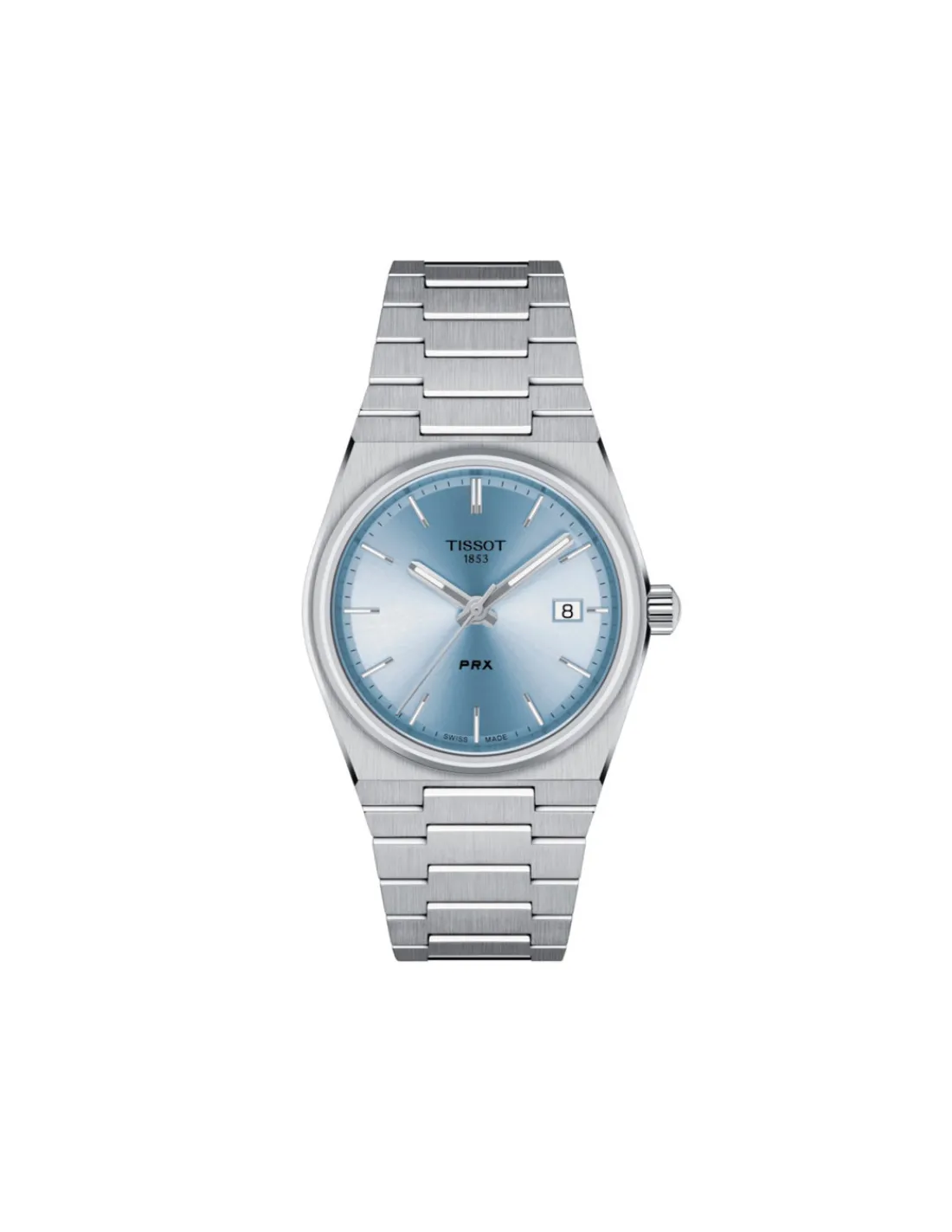 Reloj Tissot PRX para mujer con caja de acero de 35 mm de diámetro, esfera azul claro y brazalete de acero. Un reloj que se caracteriza por su caja en forma de barril que incluye caja y brazalete integrado. Movimiento de cuarzo Swiss Made.