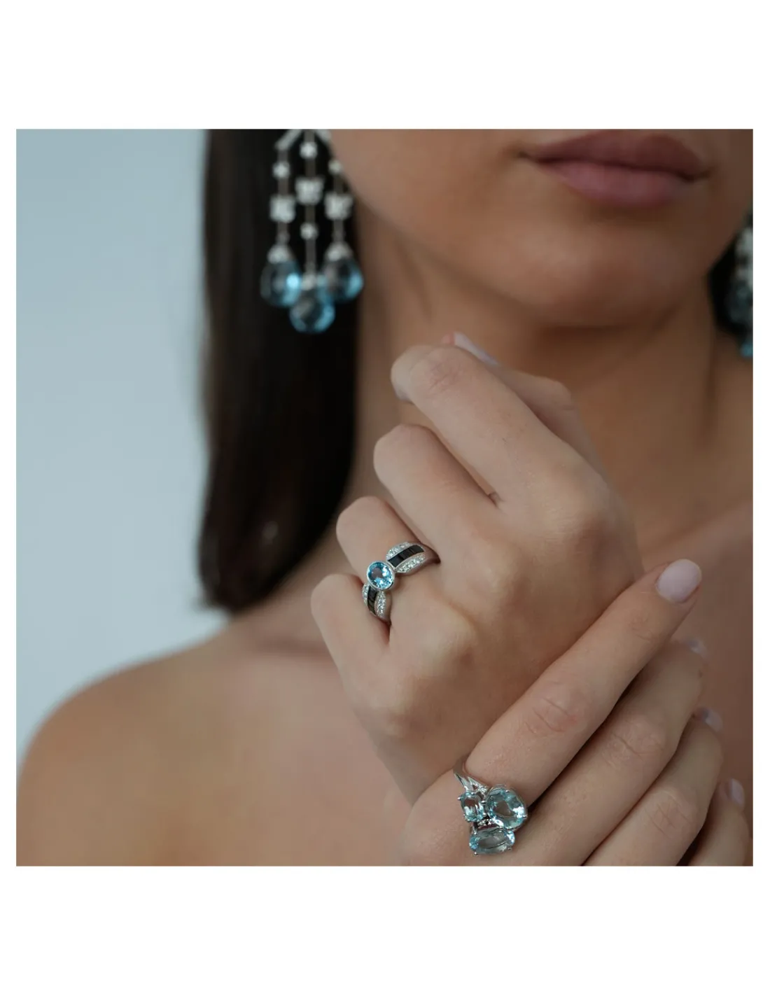 Anillo de oro blanco 1ª Ley (750 mmas) con aguamarina natural oval en el centro combinada con diamantes talla brillante y ónix.