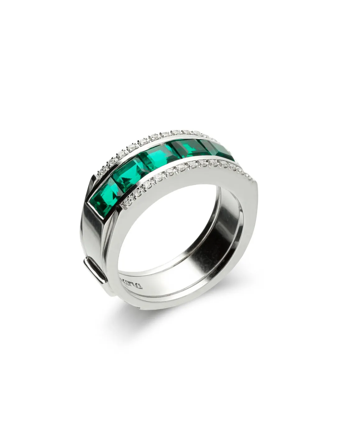 Anillo de oro blanco 1ª Ley (750 mmas) con esmeraldas talla carré y desmontable de diamantes talla brillante. Una joya muy versátil que puedes usar en cualquier ocasión gracias a su opción desmontable.