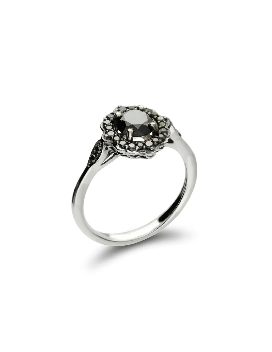 Anillo de oro blanco 1ª Ley (750 mmas) con un brillante negro en el centro rodeado por una orla de diamantes.