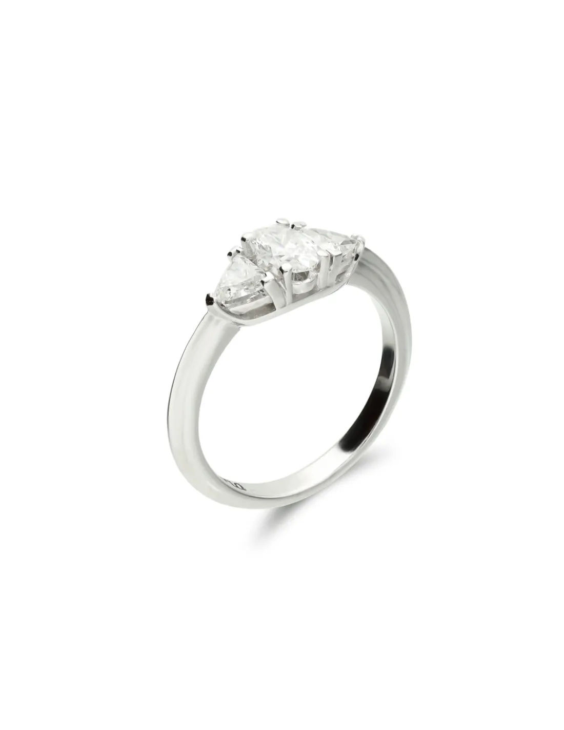 Anillo de oro blanco 1ª Ley (750 mmas) con un diamante oval en el centro acompañado de diamantes triangulares a cada lado. Talla 15.
